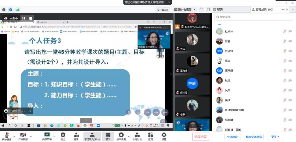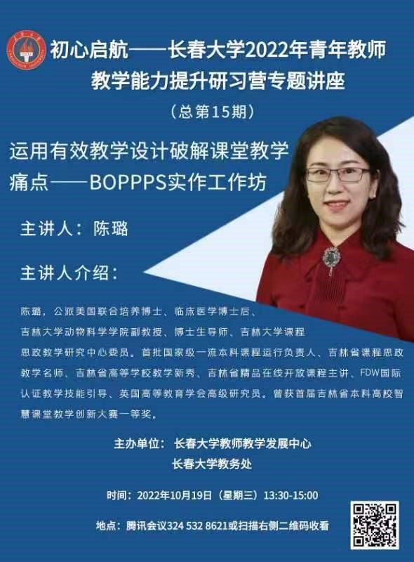 10月19日下午,旅游与地理科学学院组织全体专职教师参加由长春大学举行的2022年“初心启航”青年教师教学能力提升研习营活动。本次活动通过腾讯会议邀请到吉林大学陈璐副教授以“运用有效教学设计破解课堂教学痛点——BOPPPS实作工作坊”为题进行专题讲座。