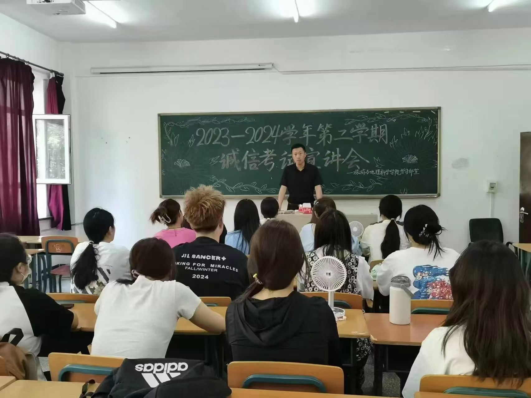 诚信,这一品质不仅仅局限于道德层面的要求,更是一种积极向上的生活态度。为了深化同学们对诚信考试的认识,促进学院内形成诚实守信的学风,进而构建公平公正的考试环境,旅游与地理科学学院学生会学习部于2024年6月19日9:45,在三教3314教室举行诚信考试宣讲。学工办主任柳志明老师主持召开会议,2021级、2022级以及2023级各班的学习委员参加会议。