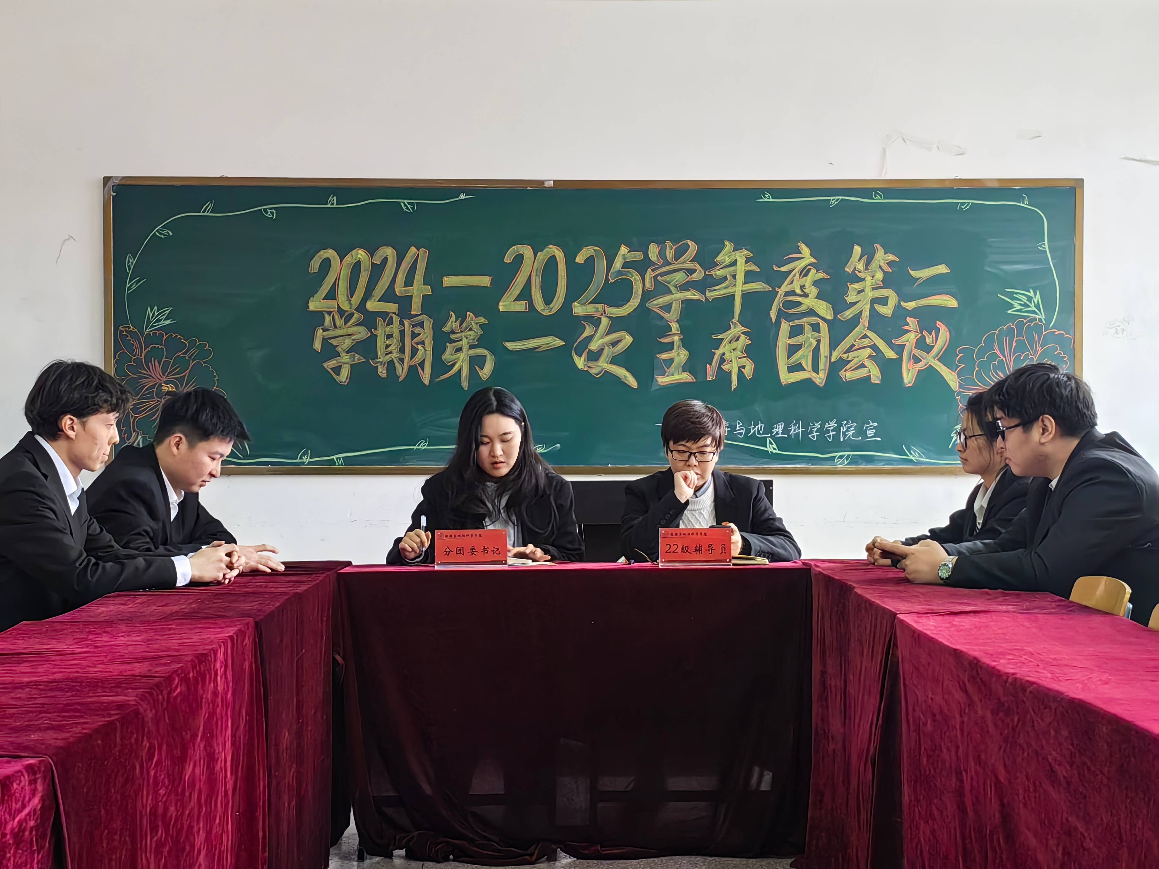 为进一步明确学期目标,凝聚团队力量,扎实推进学期重点任务、规范落实团学联迎新、换届等筹备工作, 旅游与地理科学学院于2025年3月1日14:00召开2024—2025学年度第二学期第一次主席团会议,旅游与地理科学学院分团委书记夏师澄老师、辅导员张卓老师主持召开会议,学生会主席团成员张澄俨、杨明远,社团管理中心主席团成员魏露露、孙圣博参加本次会议。