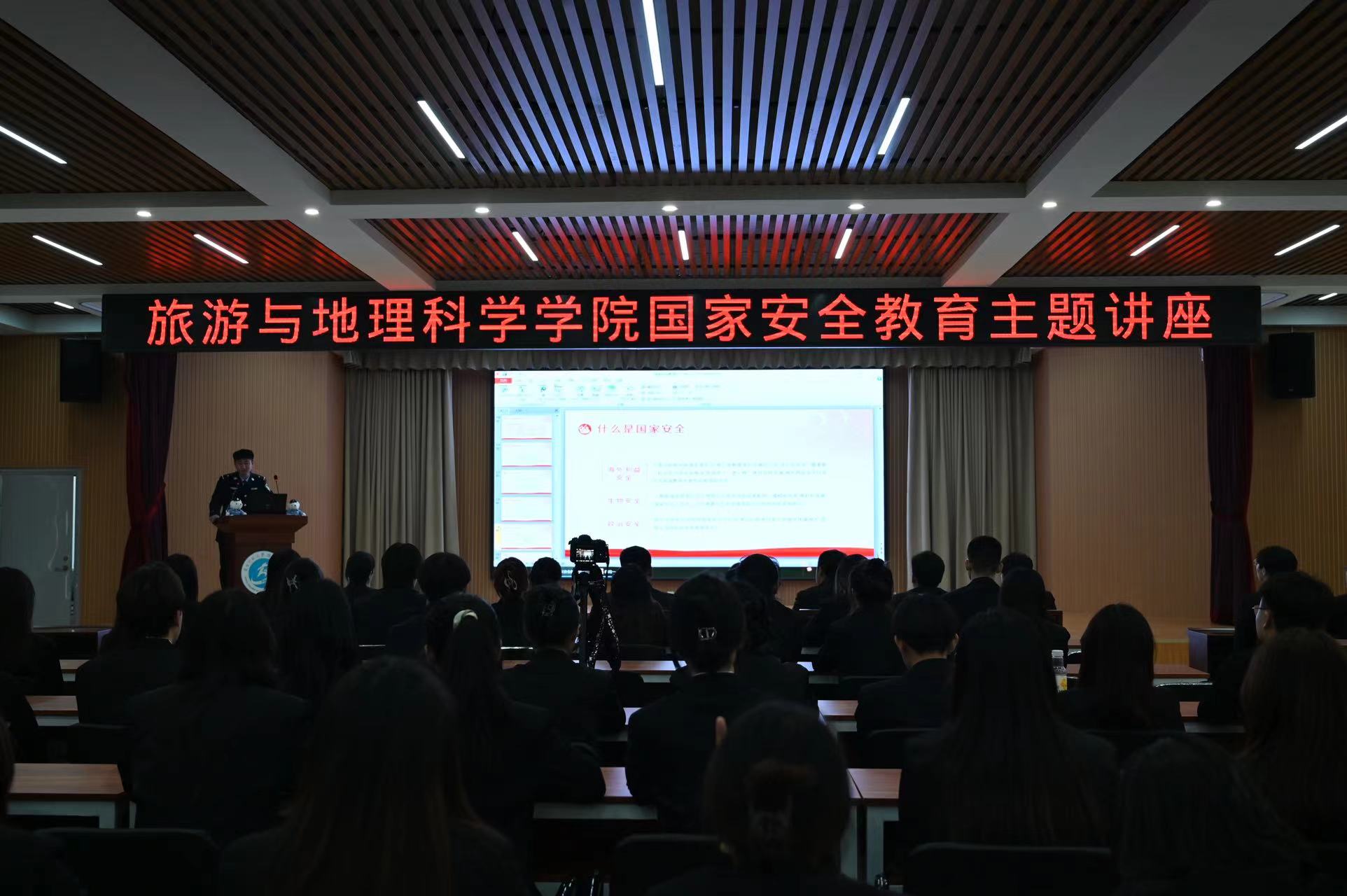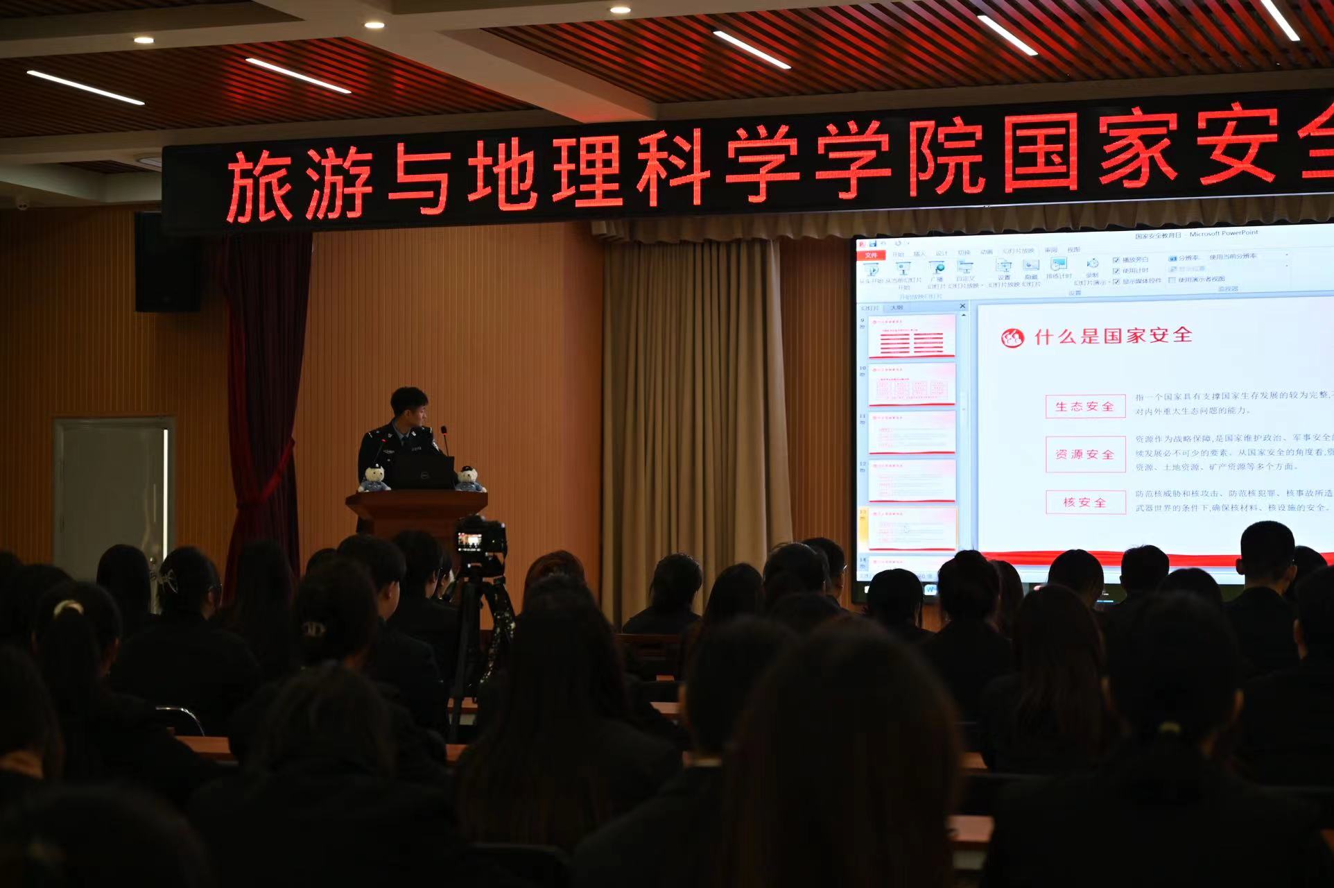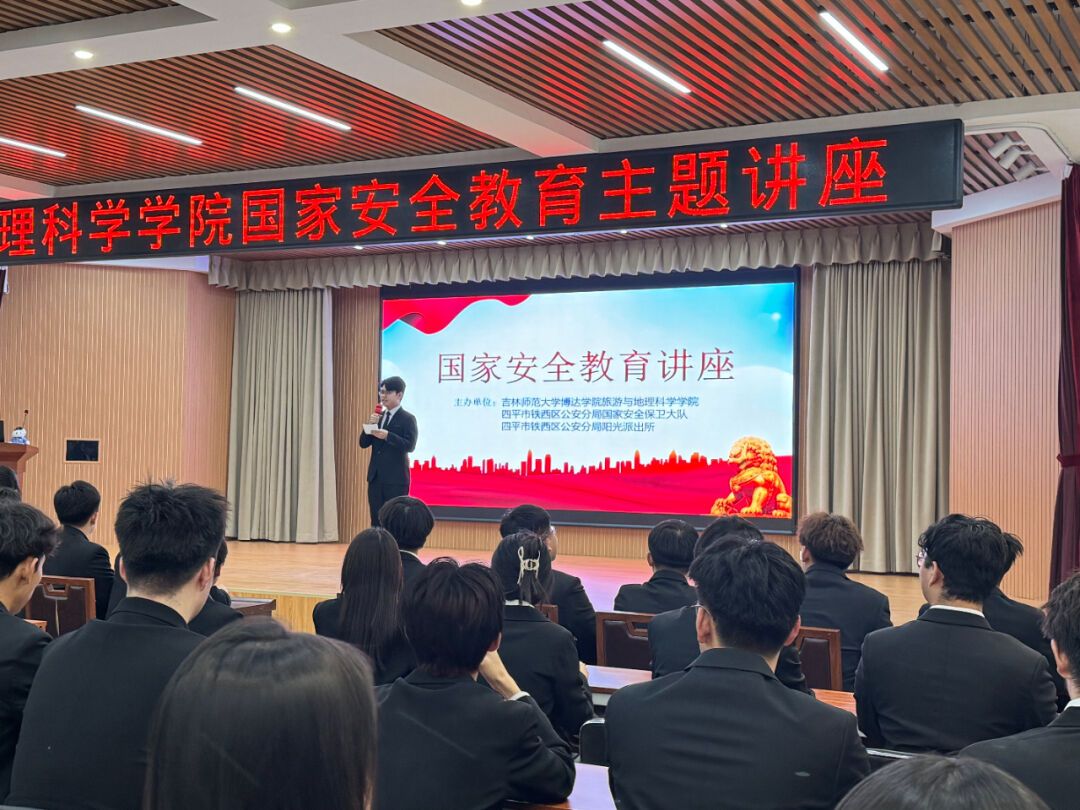 为深入学习党的二十大精神,贯彻总体国家安全观,增强全民国家安全意识和素养,夯实以新安全格局保障新发展格局的社会基础,全面普及学生的国家安全意识、风险意识,推动国家安全法治宣传教育工作深度开展。旅游与地理科学学院联合国家安全保卫大队以及阳光派出所于2024年4月10日下午在吉林师范大学博达学院图书馆报告厅召开“全民国家安全教育日”主题讲座。讲座采取线上线下结合方式进行,旅游与地理科学学院直属党支部书记柳志明、团学联全体成员及志愿者着正装到场参加。