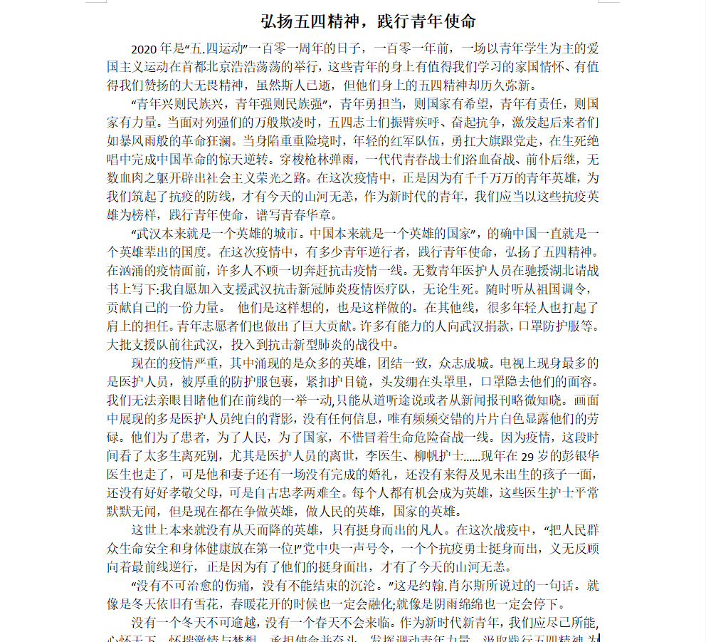 在新冠肺炎疫情防控的特殊时期,我们迎来了青年人特有的节日——五四青年节。为深入学习宣传贯彻党的精神,弘扬“五四”精神及“抗疫”精神,展现青年人担当精神,激发同学们的创作热情,旅游与地理科学学院于2020年5月1日——5月4日面向全院同学展开了“传承五四薪火,争做时代新青年”主题党日活动征文大赛。