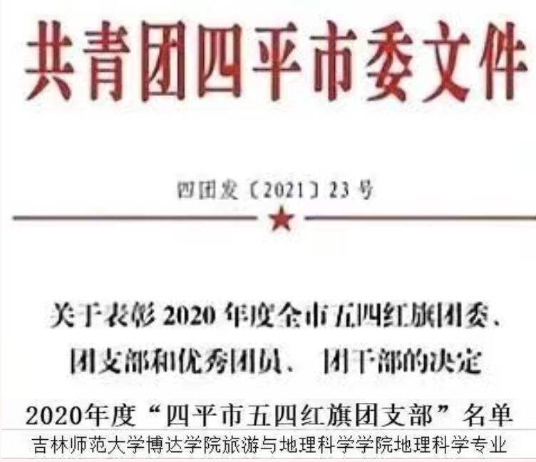 在这些优秀的组织和个人中,旅游与地理科学学院在其中占领了很重要的一席之位,旅游与地理科学学院在学生的日常工作中积极推动各项有关共青团的活动,这些也都为这次的奖项埋下了种子。2020年度“四平市五四红旗团支部”奖项由我院团支部获得。在全市共青团员中也开展了“四平市优秀共青团员”的筛选,其中我院地理科学专业学生祝淇洋同学荣获此奖项。
