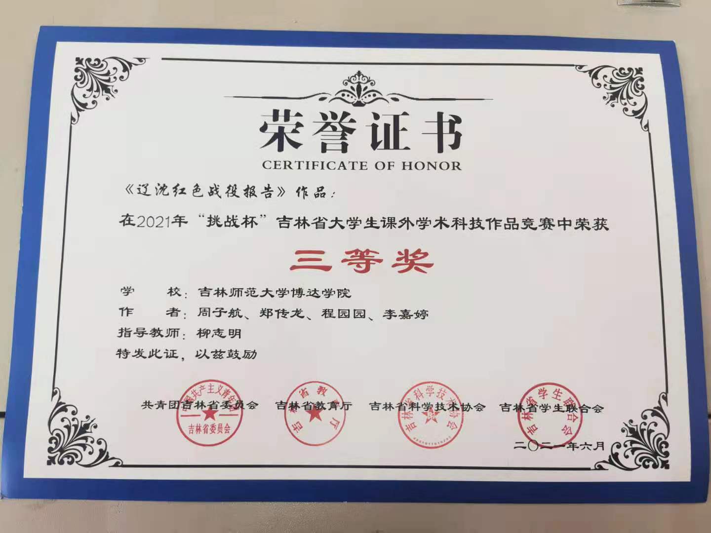 由柳志明老师指导,周子航同学、郑传龙同学、程园园同学、李嘉婷同学主笔所完成的文章《辽沈红色战役报告》,于2021年“挑战杯”吉林省大学生课外学术科技作品竞赛中荣获三等奖。