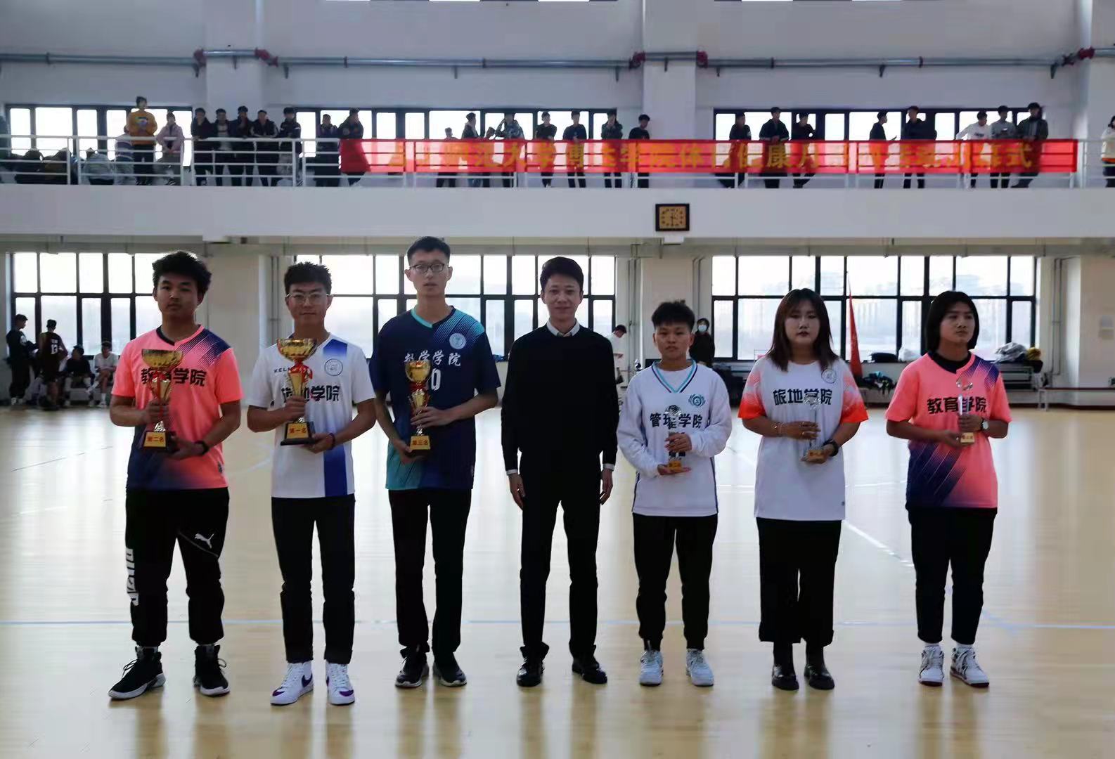 开场之前,由体育学院老师和专选学生进行了篮球表演赛。在简短的开场白之后,颁奖仪式正式开始。其中,旅游与地理科学学院获得了男足女足第一名,男排第二名,乒乓球女团第一名,乒乓球单人杨灿灿第二名,陈浩宇第三名的好成绩,展现了我旅地学子团结协作,勇往直前的精神。并为旅地运动员们在球场上的挥洒汗水,请同学们再次为旅地运动员们喝彩!最后,由体育学院刘丹院长和大院院长王国军发表讲话,并表示对运动员的感谢和支持