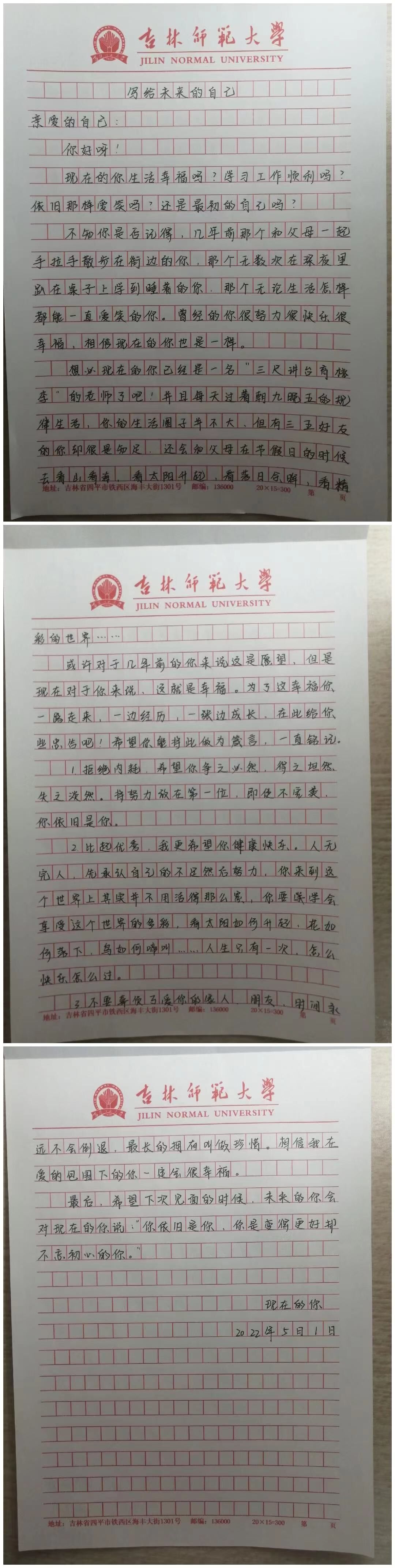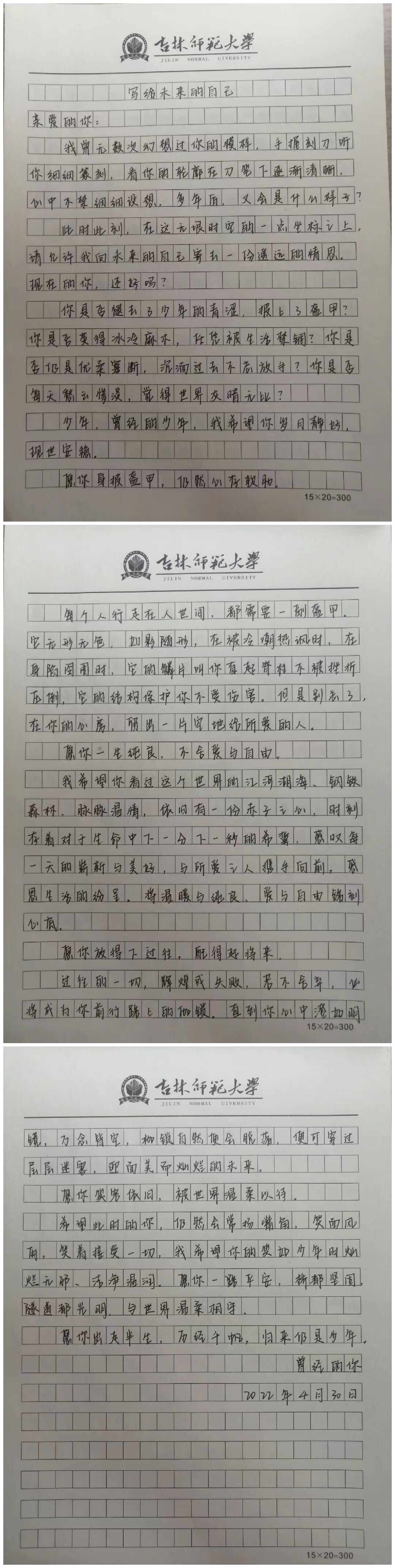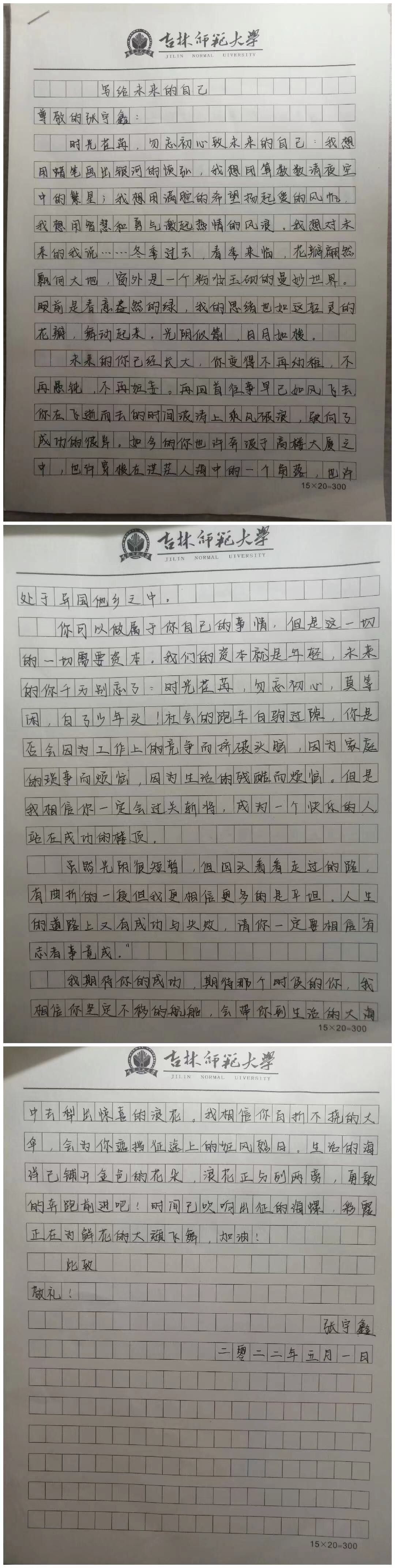 健康的心理素质是大学生素质教育的重要内容,作为社会中一个越来越重要的群体,在这样的一个阶段正处于逐步走向成熟的关键时期,更容易发生一些心理问题,特别是在疫情期间,此类问题更应该被重视。因此,旅游与地理科学学院心理健康部开展了“畅想青春,书写心灵”之“写给未来的自己”的书信作品征集活动,意在释放同学们在疫情期间的心理压力,帮助旅游与地理科学学院的同学们以积极健康的心态,面对生活和学习中遇到的各种各样的问题。
