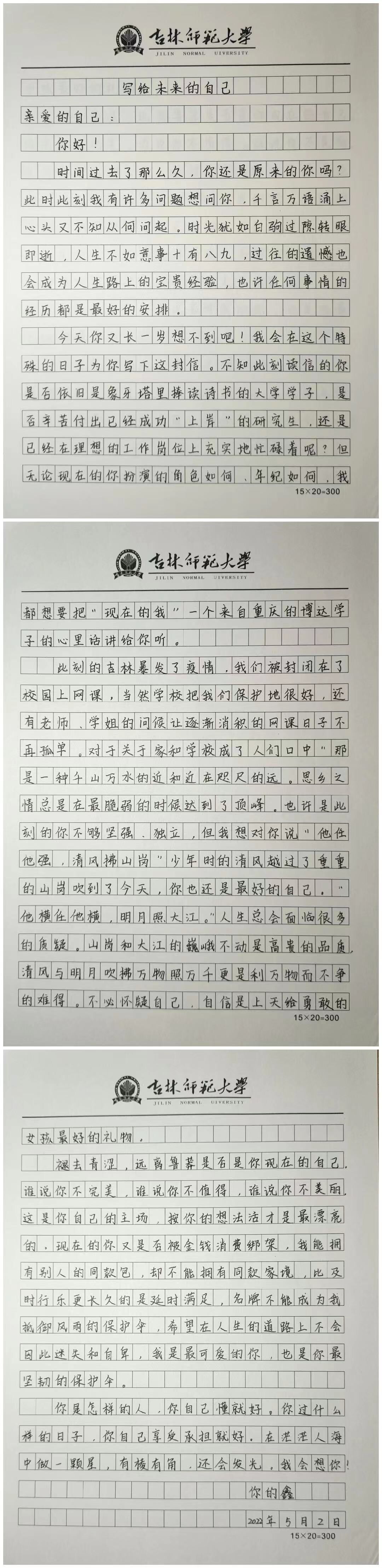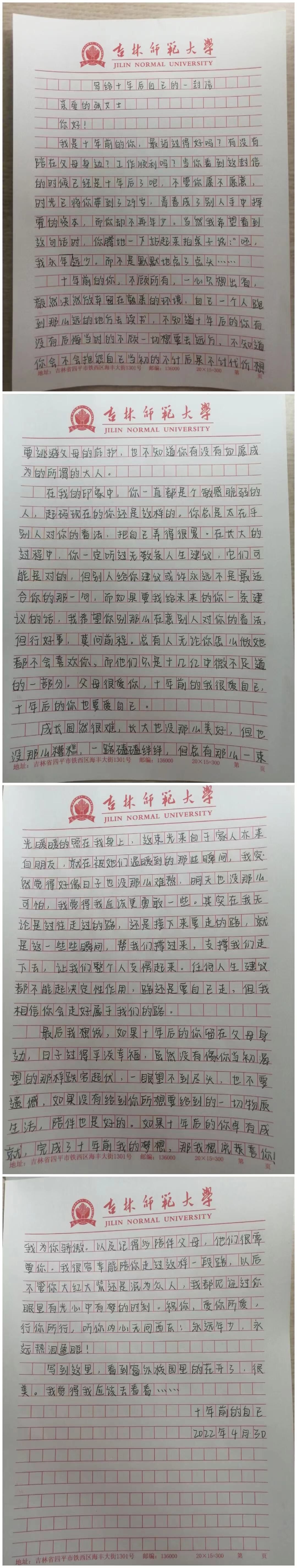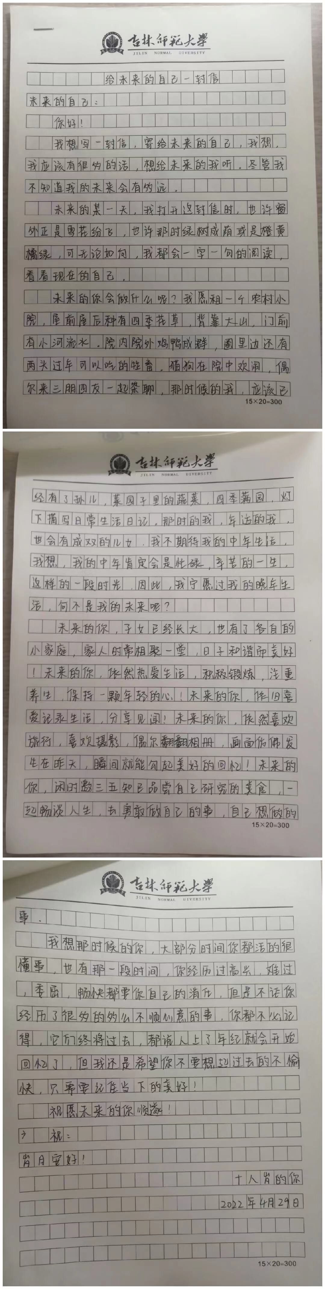 健康的心理素质是大学生素质教育的重要内容,作为社会中一个越来越重要的群体,在这样的一个阶段正处于逐步走向成熟的关键时期,更容易发生一些心理问题,特别是在疫情期间,此类问题更应该被重视。因此,旅游与地理科学学院心理健康部开展了“畅想青春,书写心灵”之“写给未来的自己”的书信作品征集活动,意在释放同学们在疫情期间的心理压力,帮助旅游与地理科学学院的同学们以积极健康的心态,面对生活和学习中遇到的各种各样的问题。