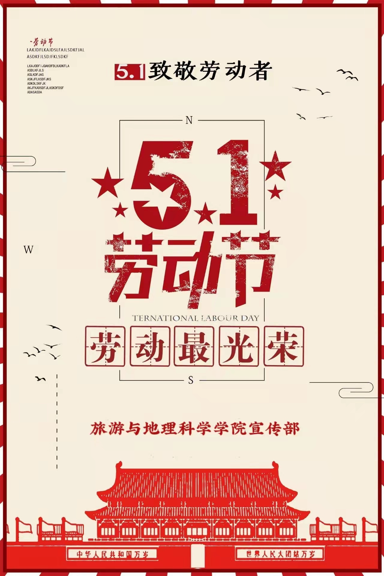 春风浩荡劳动节,春色鲜花迎五一。旅游与地理科学学院宣传部携手致敬每一个为生活而努力的人,感谢战疫中每个劳动者的努力和坚守,祝愿您们五一劳动节快乐!