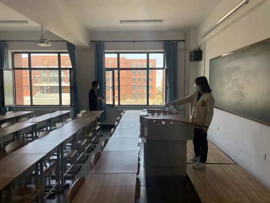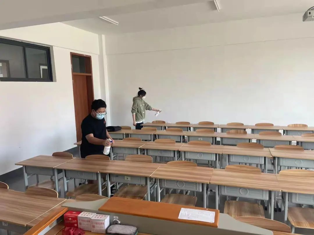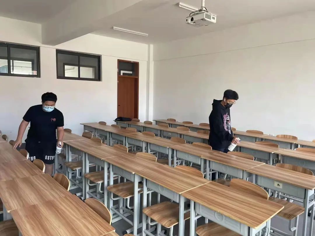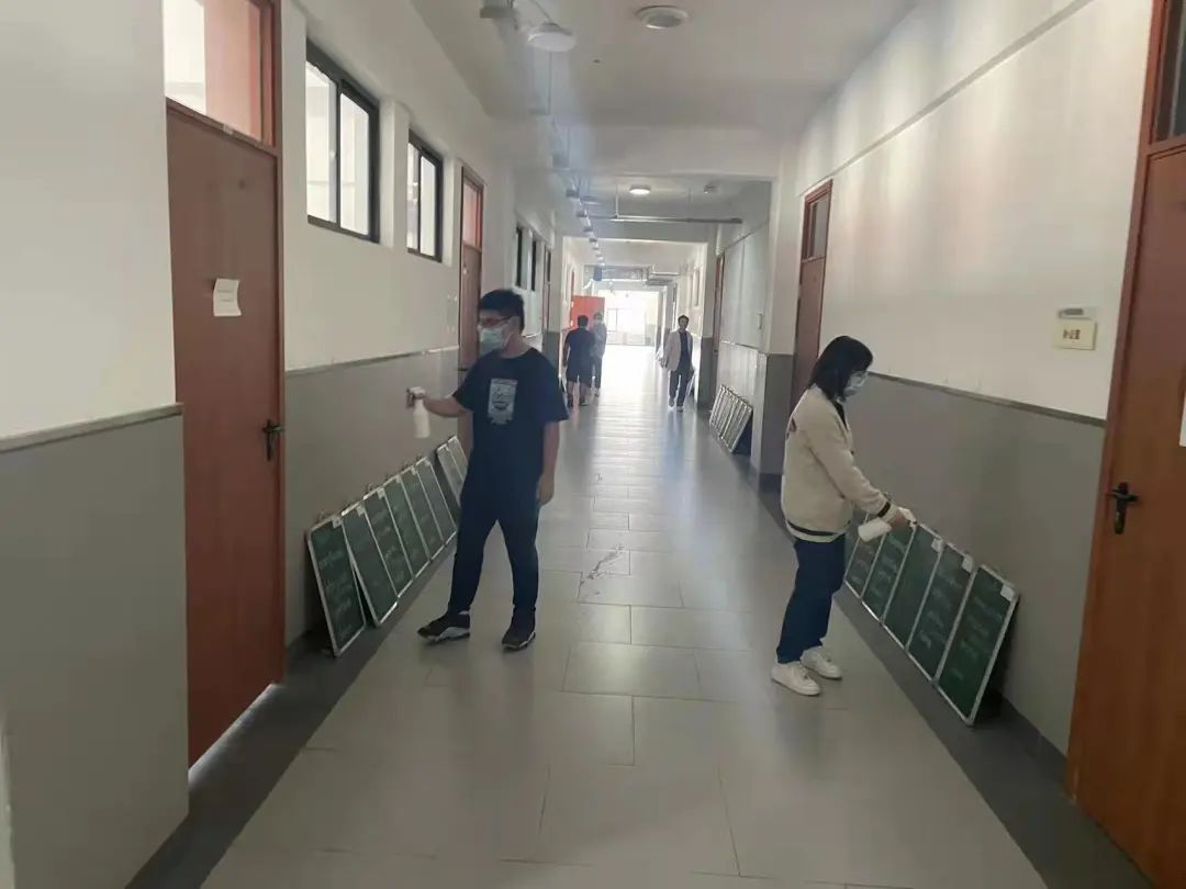 即使现在学校仍然进行网课,暂未开启线下上课,旅游与地理科学学院的党员们仍自愿参与教室消杀工作。他们手握酒精喷枪,不放过教室里的每一个角落。疫情防不胜防,党员们全心全意投入疫情防疫工作当中,为同学们全心全意服务。