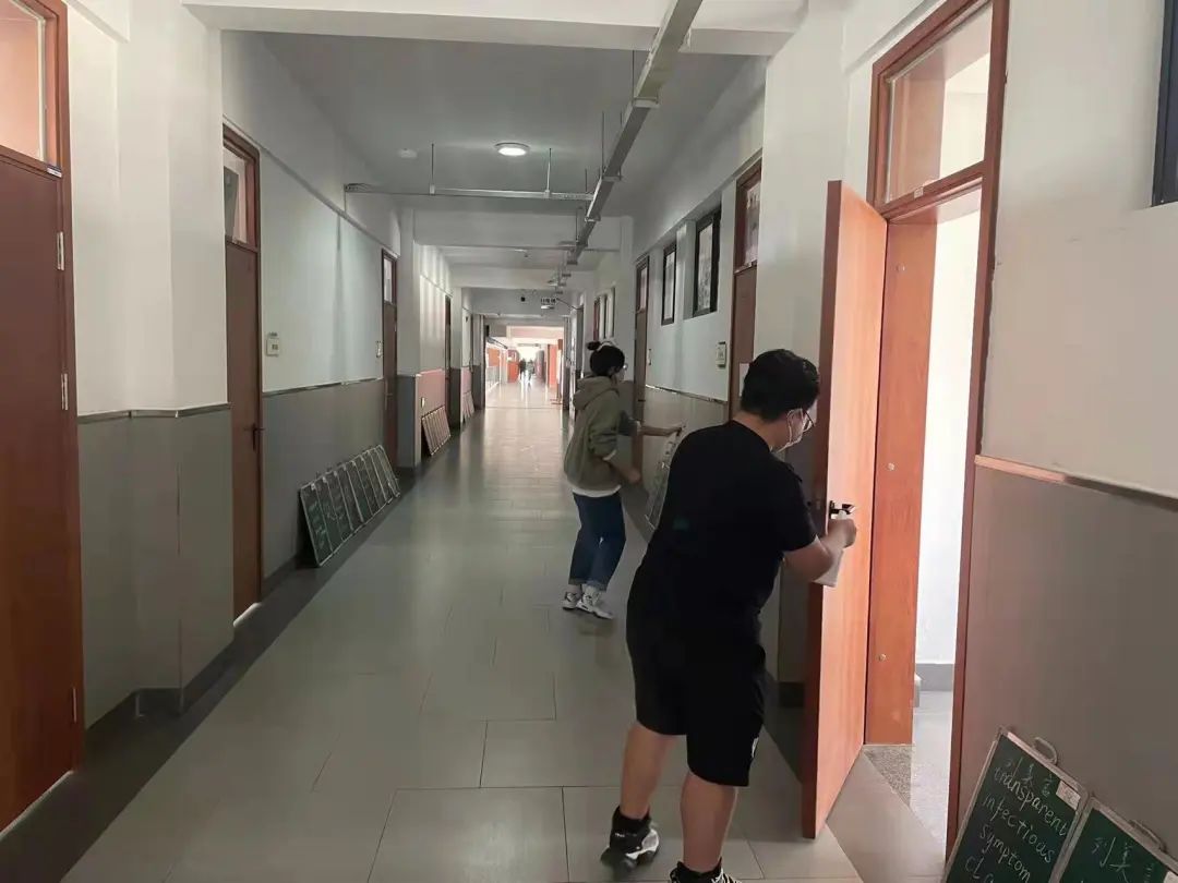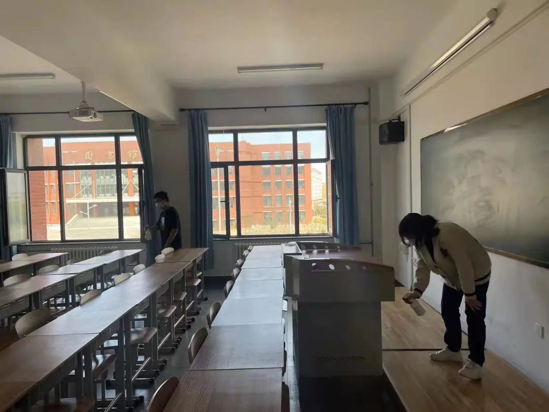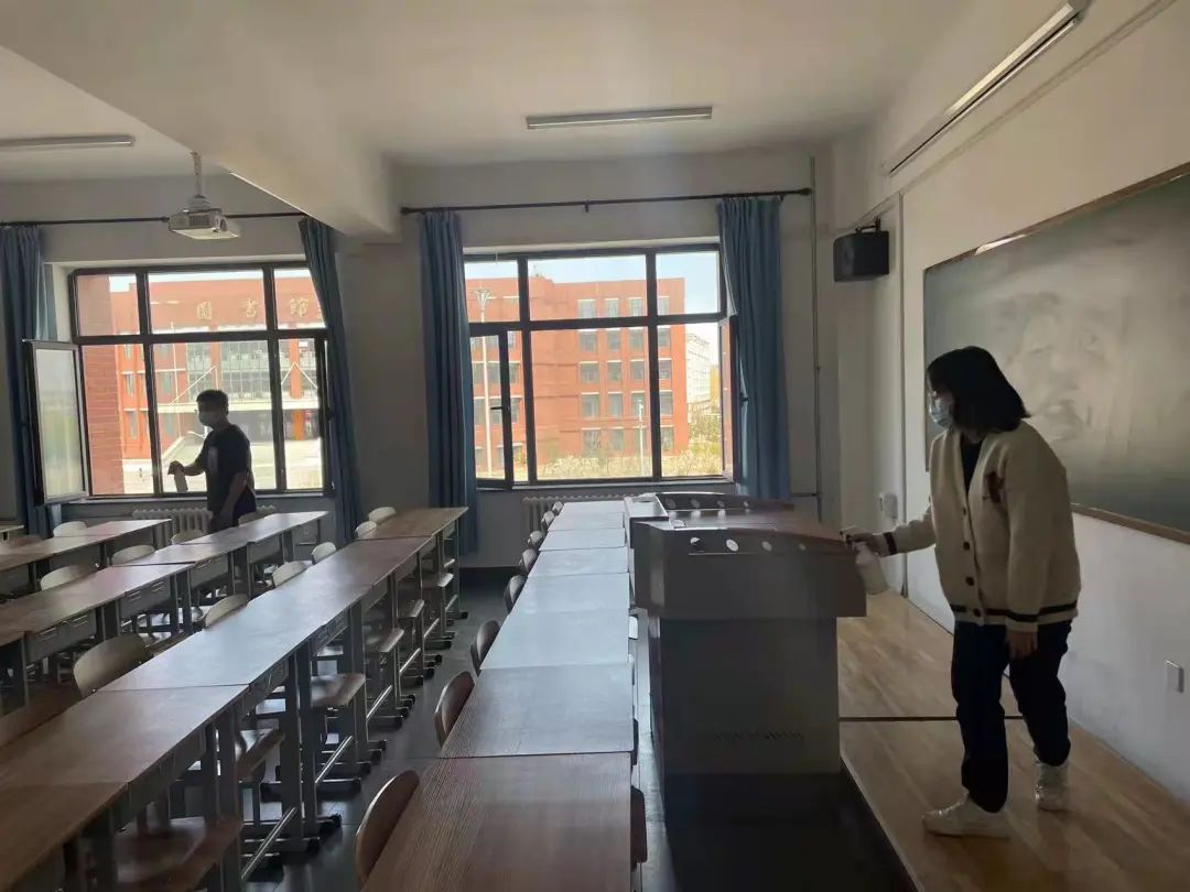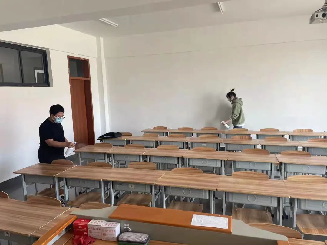 即使现在学校仍然进行网课,暂未开启线下上课,旅游与地理科学学院的党员们仍自愿参与教室消杀工作。他们手握酒精喷枪,不放过教室里的每一个角落。疫情防不胜防,党员们全心全意投入疫情防疫工作当中,为同学们全心全意服务。