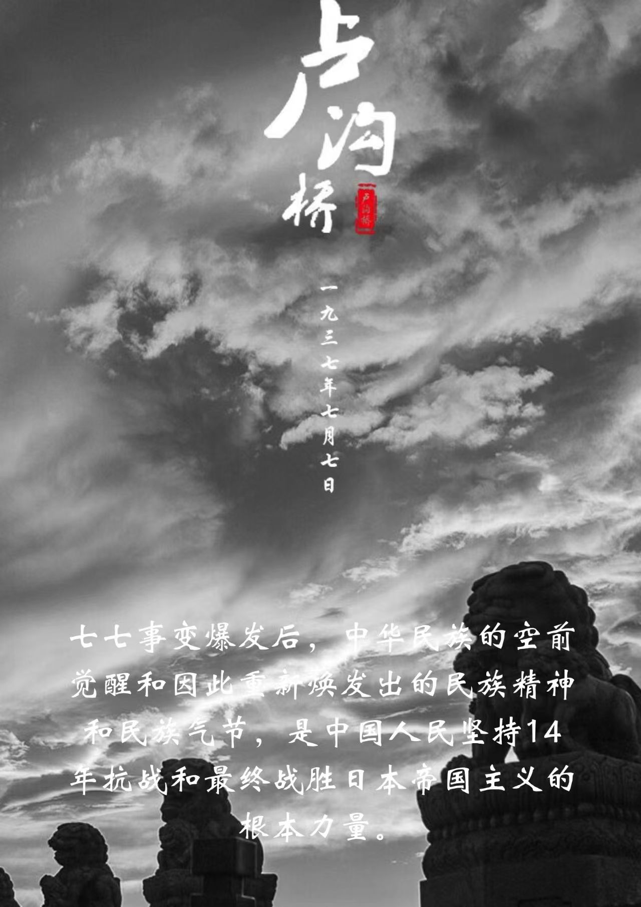 历史永远定格在1937年7月7日的那天晚上,枪声唤醒了中华民族百年的沉睡,这一天投下长达八年的暗夜,遮覆了3500多万同胞的尸首;这一天印着一个民族心灵上难以治愈的伤痛;这一天记录着中国人难以忘却的仇恨和耻辱。直至抗日战争结束,中华民族的百年衰败沉沦自此开始扭转,古老中国从此走向民族独立与自强。
