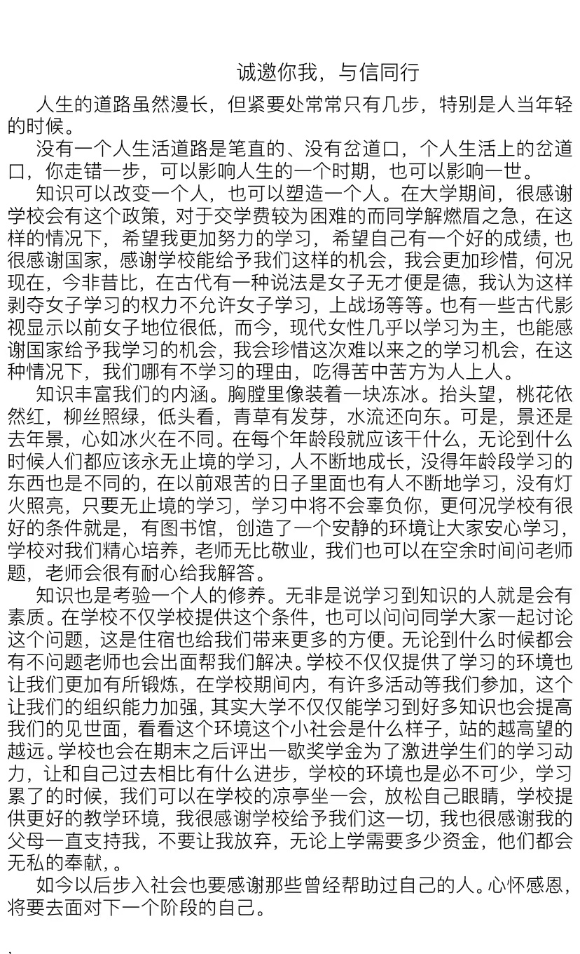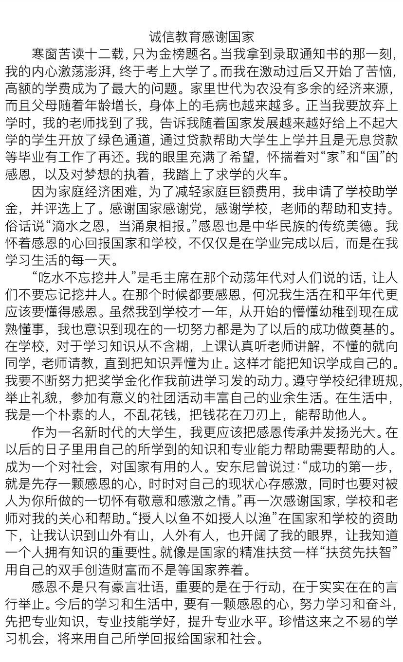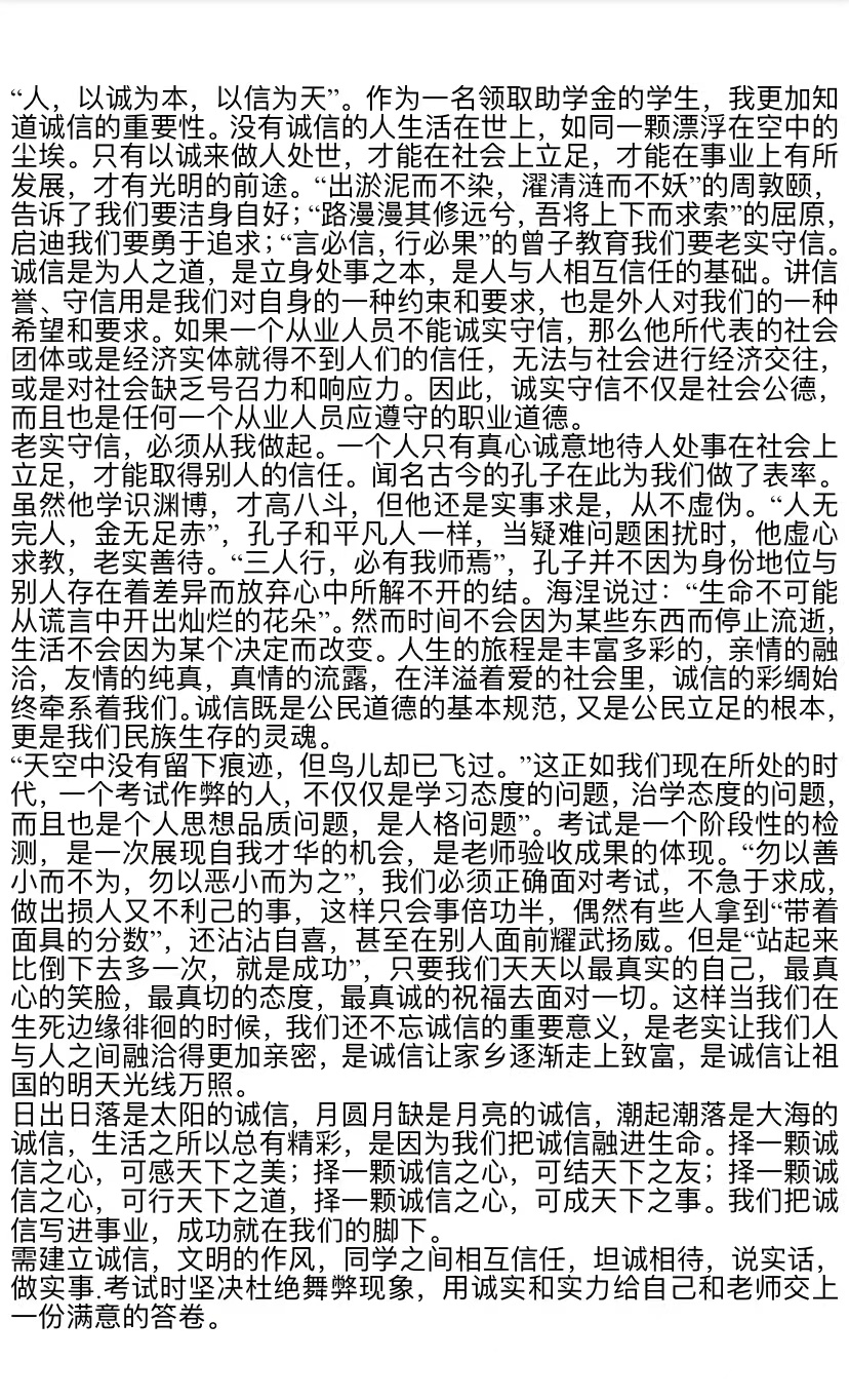诚信,就是要诚实守信,这既是中华民族的传统美德,也是建设现代化新型社会的基石。为了增强旅游与地理科学学院学子们的诚信和感恩意识,学习部于2022年5月27号-6月10日在线征文,开展以“诚邀你我,与信同行”为主题的征文比赛,反思不诚信行为的影响,使诚信深入人心。