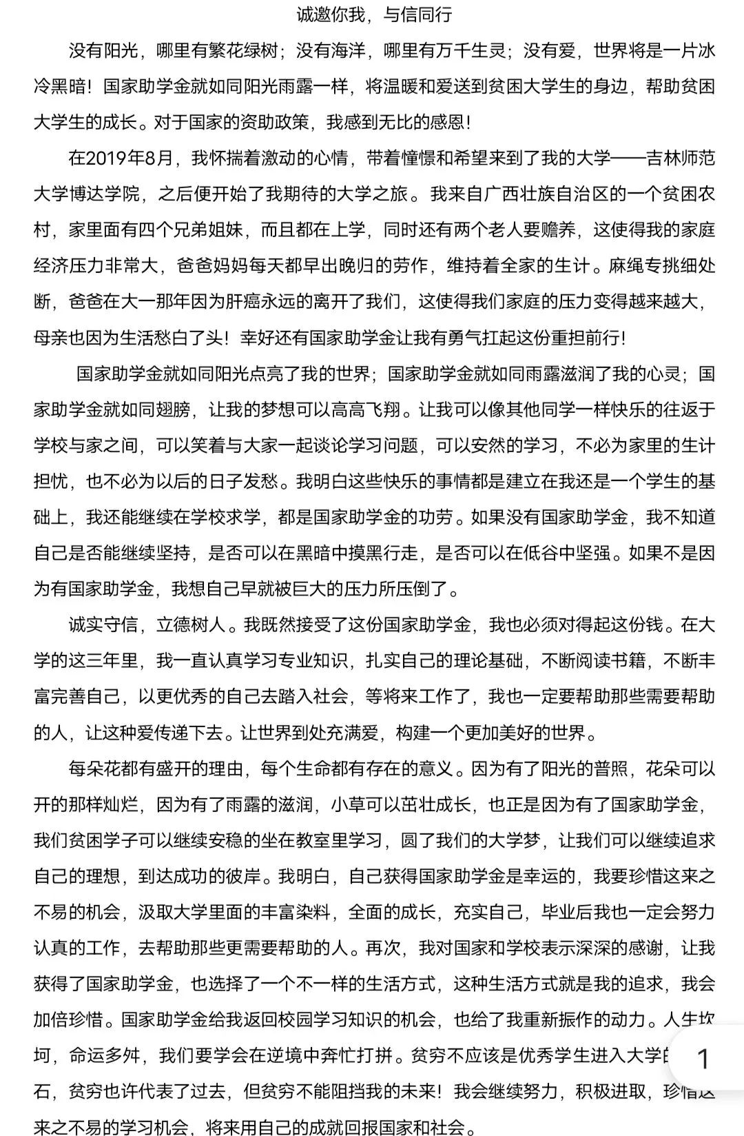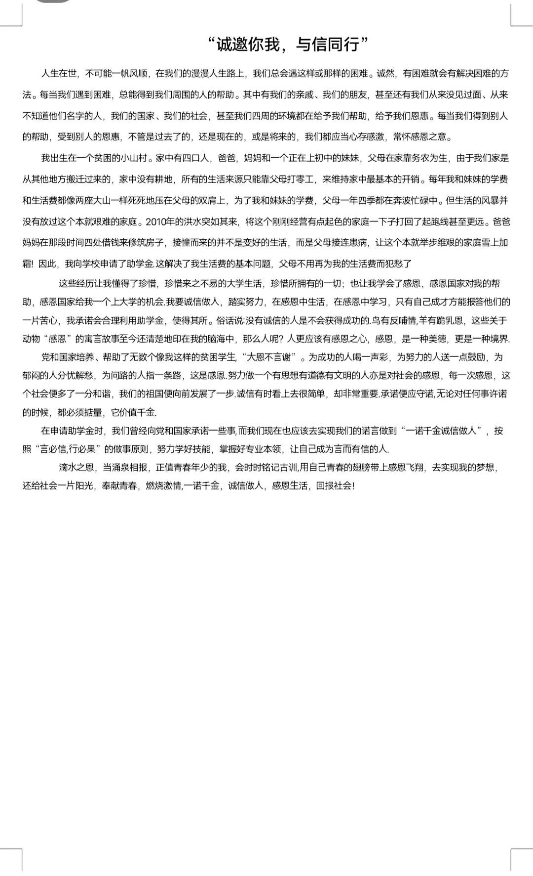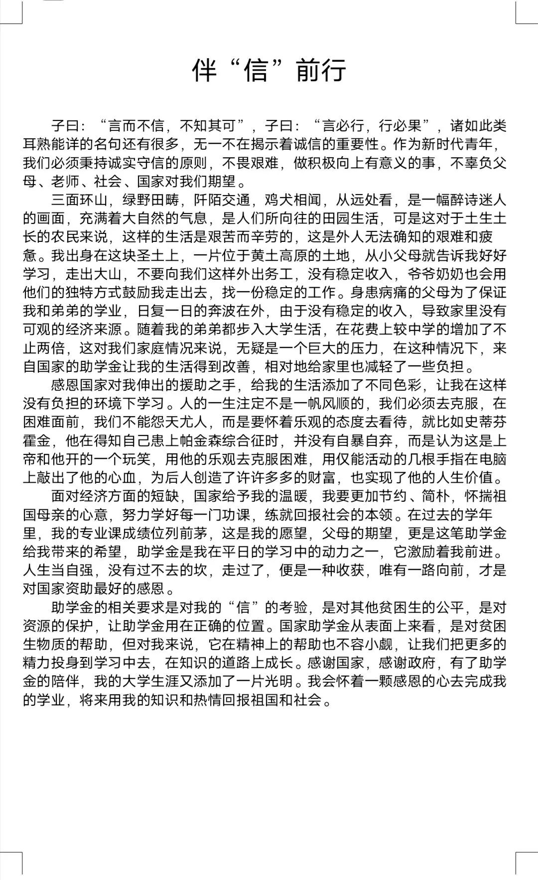 诚信不仅是一种品行,更是一种责任;不仅是一种道义,更是一种准则。为了增强旅游与地理科学学院学子们的诚信和感恩意识,学习部于2022年5月27号-6月10日在线征文,开展以“诚邀你我,与信同行”为主题的征文比赛,反思不诚信行为的影响,使诚信深入人心。