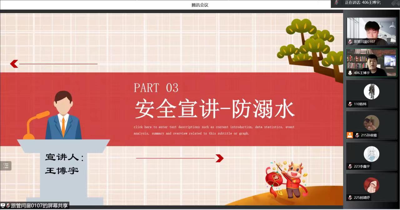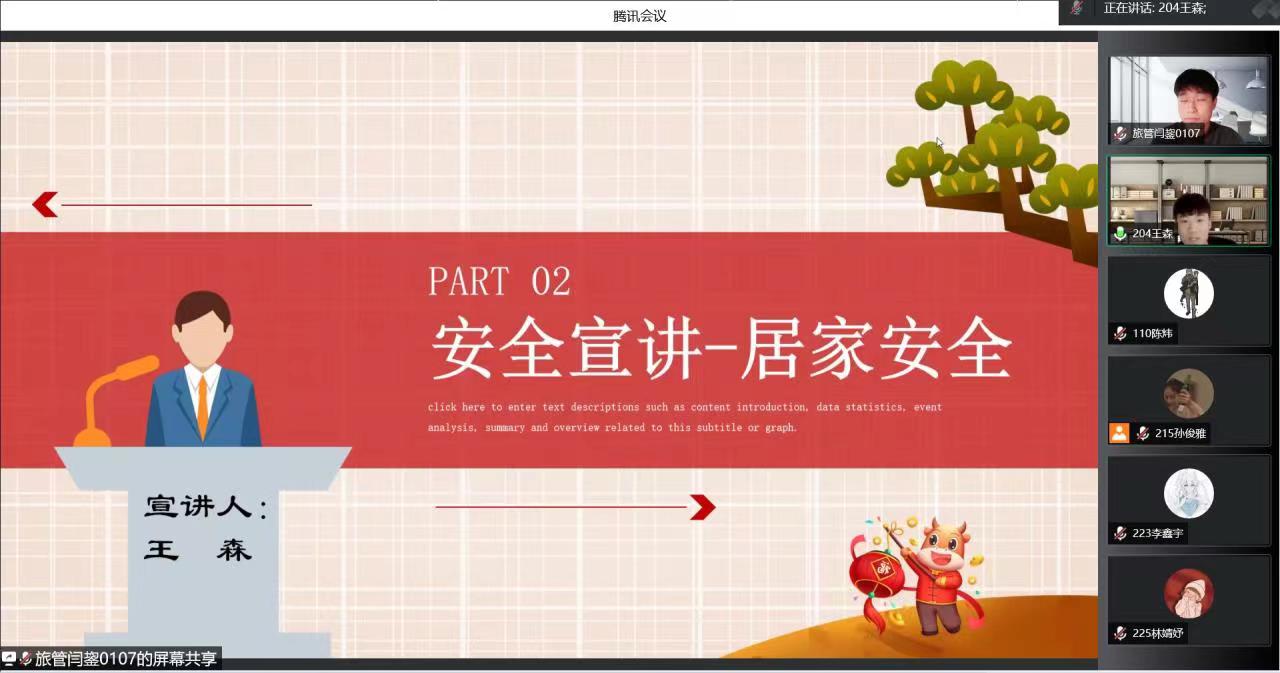 本次活动由舍务部部员闫鋆同学主持,郑思彤和李鑫宇同学分别向大家讲述关于安全方面的知识,由王森,王博宇,王鹤颖同学进行安全宣讲,黄政同学做总结。