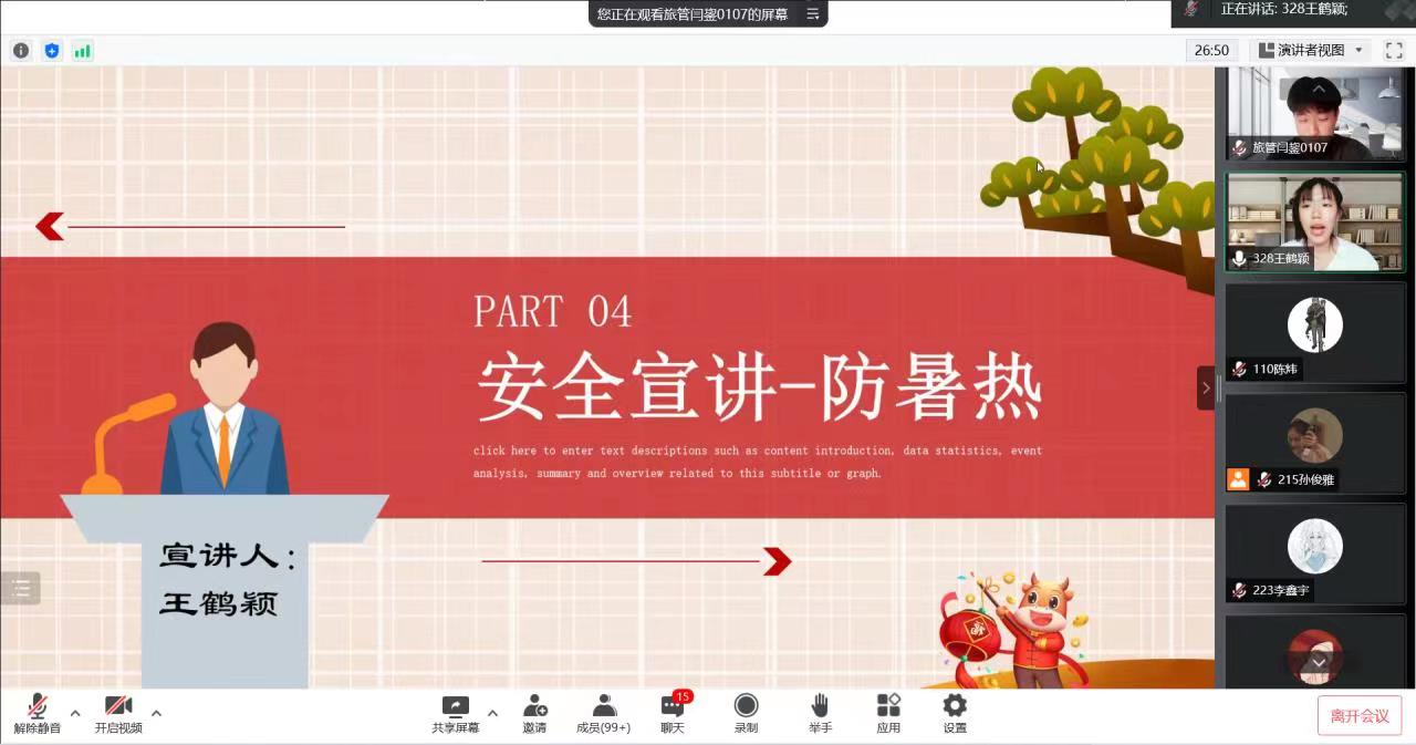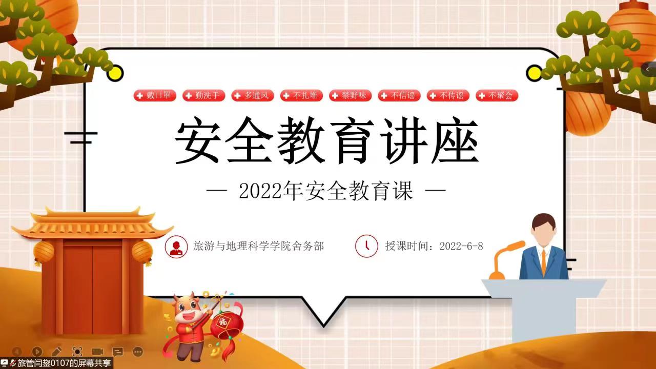 为了提高同学们居家网课的安全意识,让同学们能够贯彻落实安全教育的精神,落实各项要求与举措,保护好自己和周围的人,旅游与地理科学学院舍务部在六月八日下午两点开展线上安全教育讲座,向同学们普及各方面的安全教育知识,使同学们在家也能有一个安全舒适的学习环境。