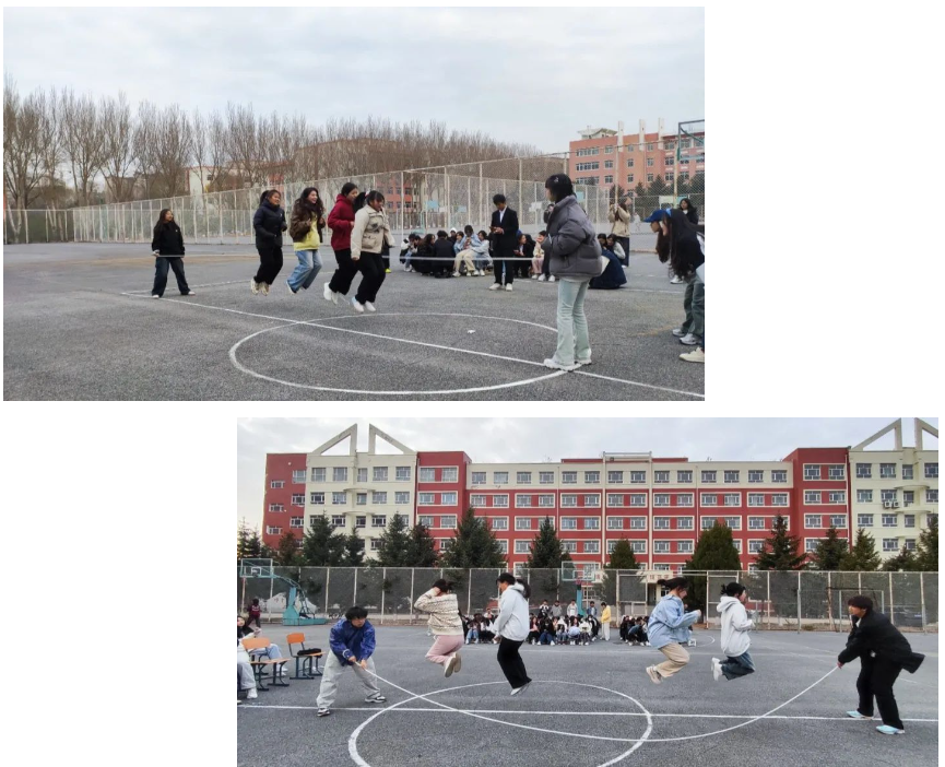 每班派出六名同学,两人持绳,四人跳,可停顿重跳,规定时间内累积次数多者胜。