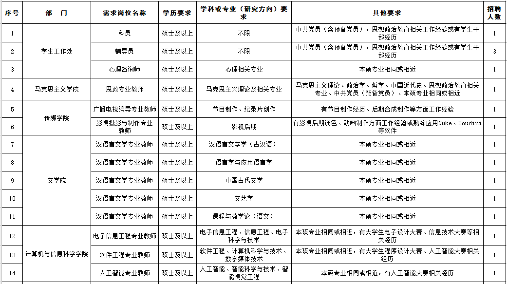 2.学校招聘工作统一由学院人事处负责组织实施,所有招聘信息均会通过我学校官网、官微发布,且不会以任何名义收取费用。对于学校未对外公开发布的招聘信息请求职者注意甄别、核实,勿轻信其他途径的虚假信息而上当受骗。