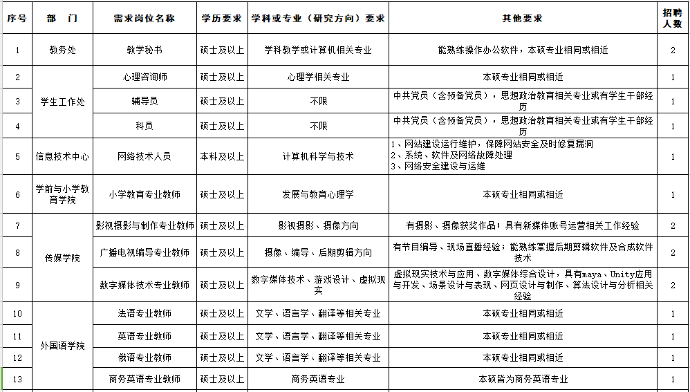 2.学校招聘工作统一由学院人事处负责组织实施,所有招聘信息均会通过我学校官网、官微发布,且不会以任何名义收取费用。对于学校未对外公开发布的招聘信息请求职者注意甄别、核实,勿轻信其他途径的虚假信息而上当受骗。