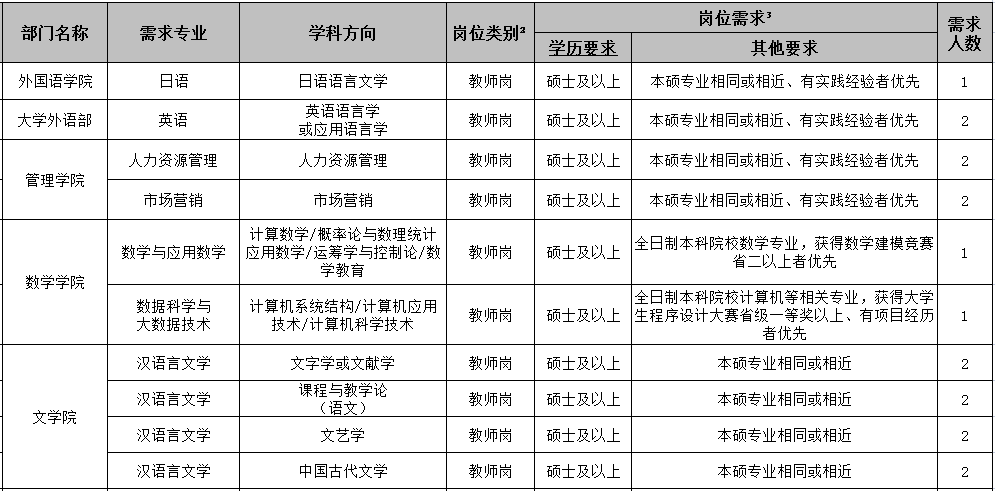 要求各岗位应聘者具备硕士及以上学历,应聘教师岗位要求本硕专业相同或相近;海外学历须持有教育部留学归国服务证明;具有讲师及以上职称优先。