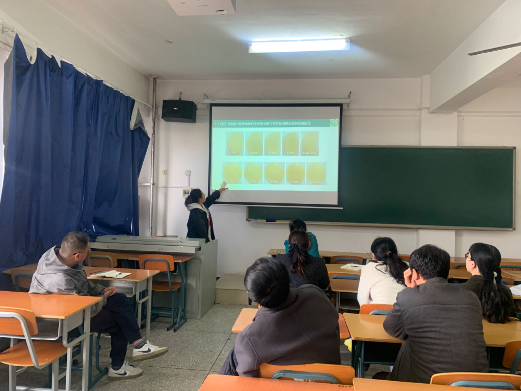随后,新入职教师林嘉琪结合自己的研究方向,针对《挤压协同棕榈酸和麦芽糖醇对玉米淀粉回生及馒头品质的影响研究》论文的试验设计和研究方法为全体教师做了介绍。