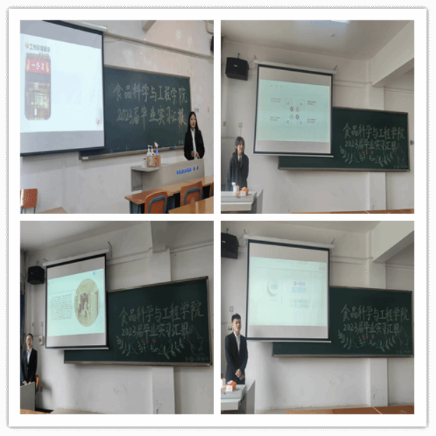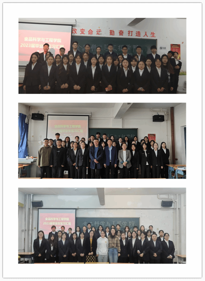 食品科学与工程学院于5月12日8:30在1310、1316、1317三个教室举行了2023届毕业生实习汇报会。学院毕业实习指导教师参加了实习汇报,所有毕业生正装出席,精心准备PPT向老师和同学们汇报自己的实习情况。