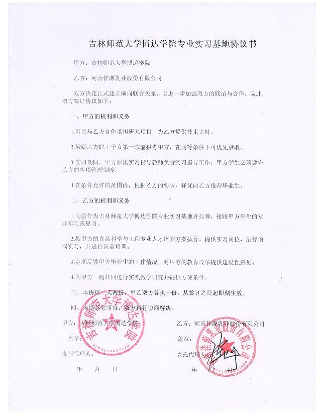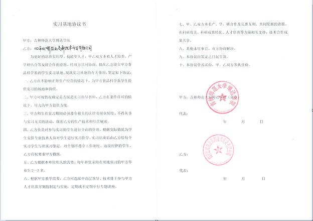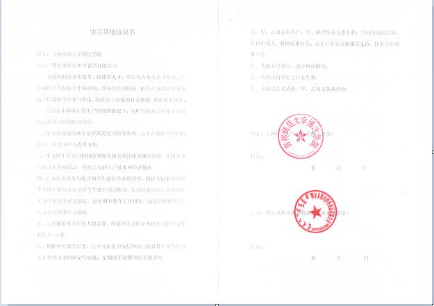 四平地区拥有一流的食品企业集团,包括金士百纯生股份有限公司、宏宝莱股份有限公司、新天龙股份有限公司、天成玉米开发有限公司、四平海鲸食品酿造有限公司和四平市声旺食品有限公司等国内优秀的食品加工企业,本专业学生的实训具有得天独厚的地域优势。同时,与省内外知名食品企业建立产学研合作关系,目前已达成意向和签订完成产学研实践教学基地10个,包括四平市名居红酒庄、金士百纯生股份有限公司、宏宝莱股份有限公司、新天龙股份有限公司、天成玉米开发有限公司、河南佳源乳业股份有限公司、鄂尔多斯市伊香食品有限公司等。我学院正在积极运作与企业做校企联合,采取订单培养方式进行人才培养。在“产、学、研”合作中,让学生能够在走出校门前零距离的接触企业方的真实需求。