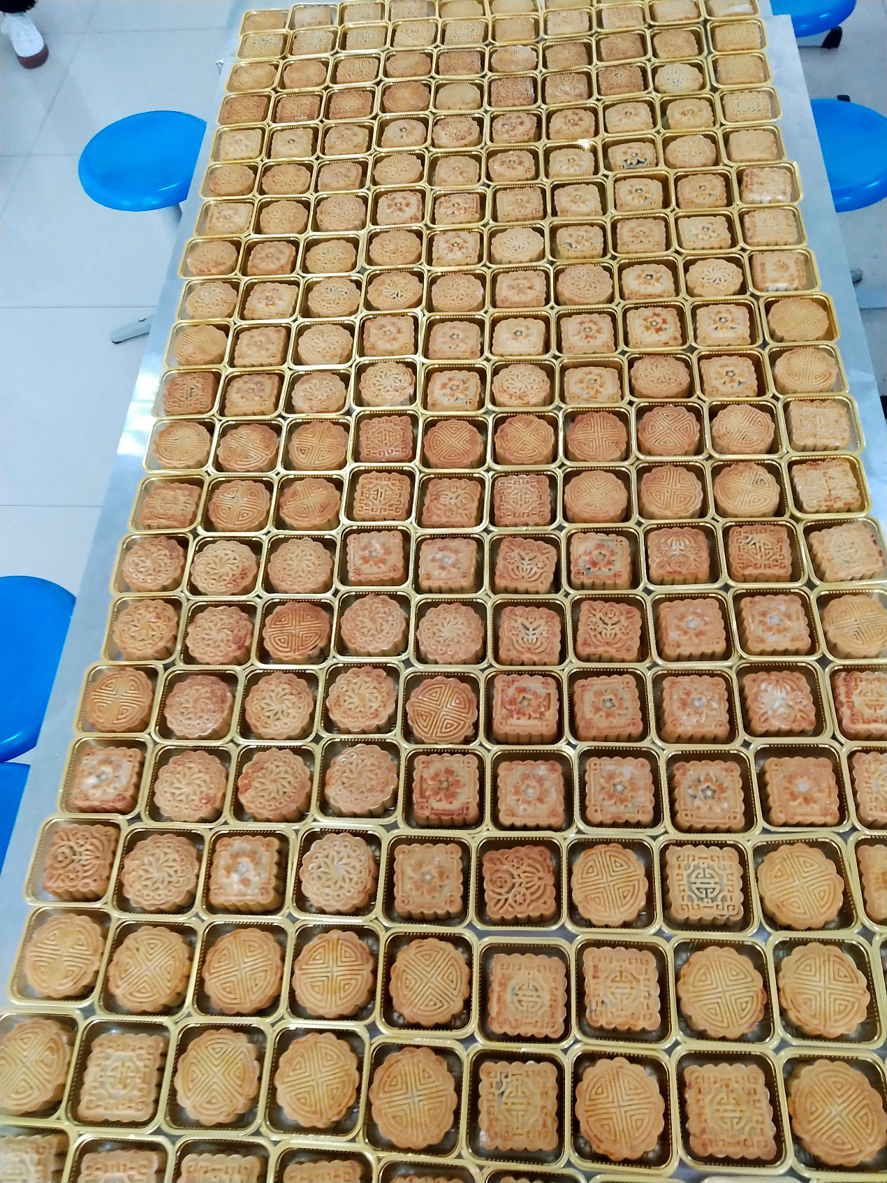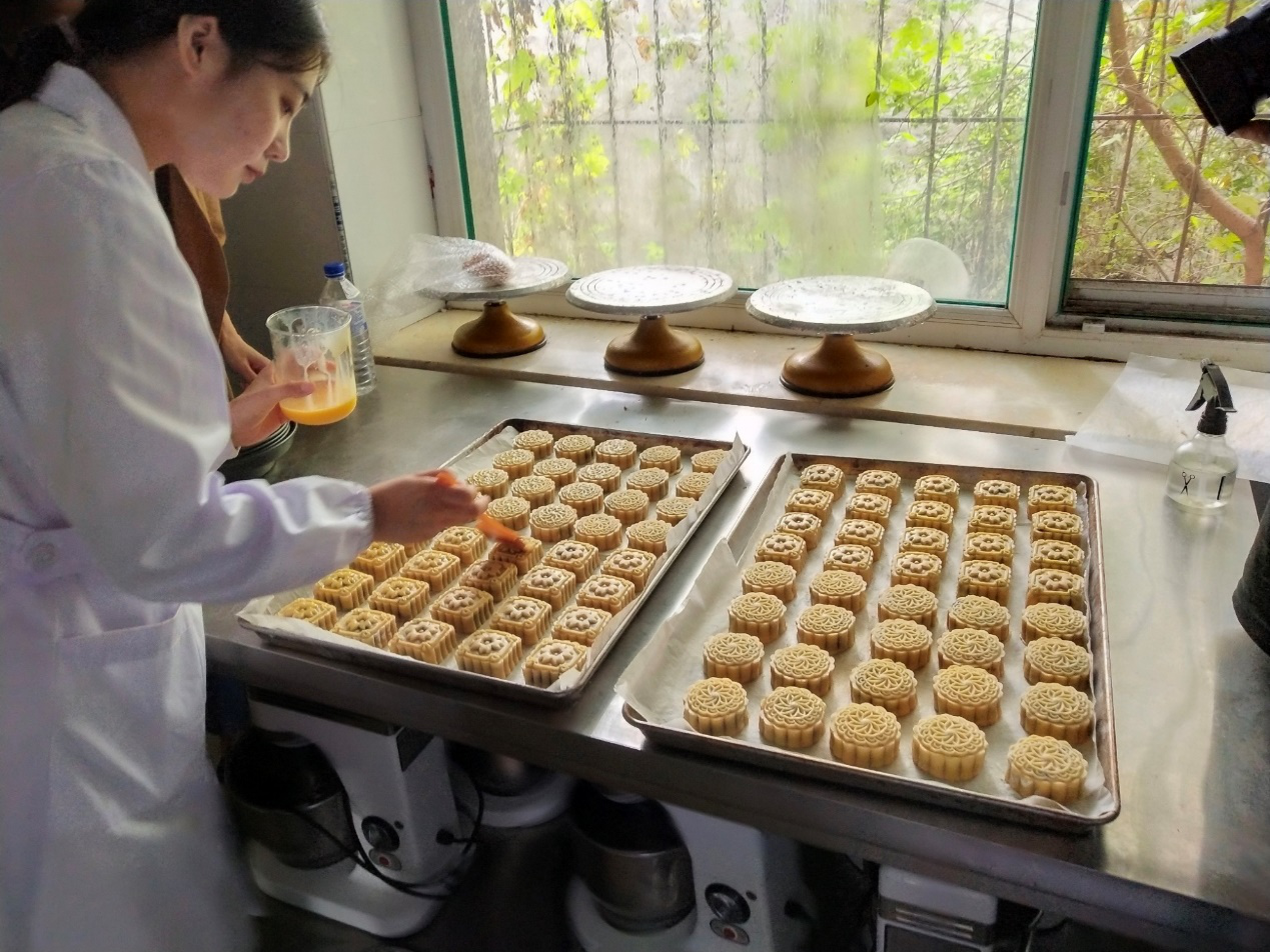 本次制作的是广式月饼,其最大的特点就是皮薄馅大,同学们选取了枣泥、豆沙,五仁三种经典馅料。同学们按照配方严格称取材料,严格按比例和面,醒发,制馅,包月饼、成型、烘烤、冷却、包装、封口。一整套流程走下来,一块块饱含热情和感恩的月饼就制成了。
