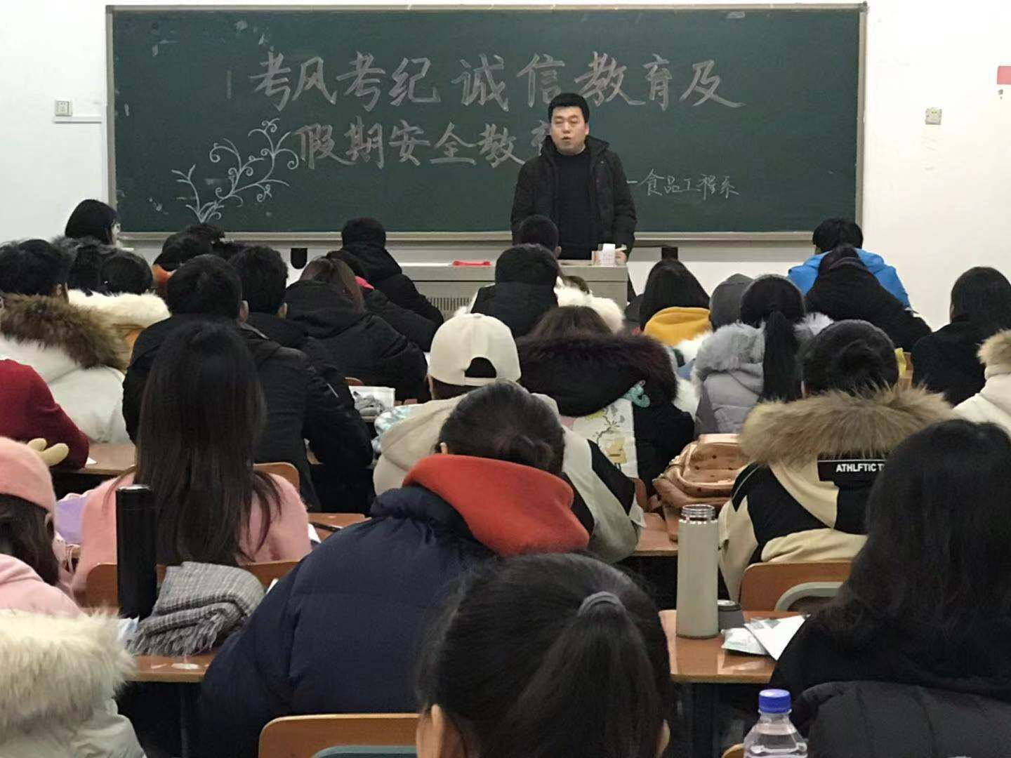 为推动诚信校园建设,强化学生诚信意识,以及加强学校安全教育和管理,确保寒假假期安全。12月27日晚,食品工程系学工办负责人汤鹏宇老师主讲题为“考风考纪 诚信教育及假期安全教育”的主题班会。