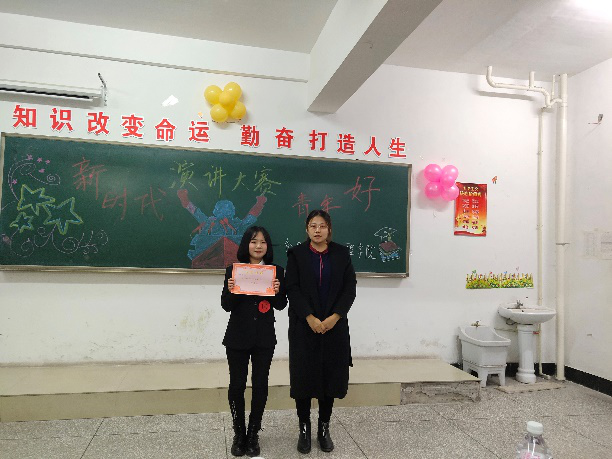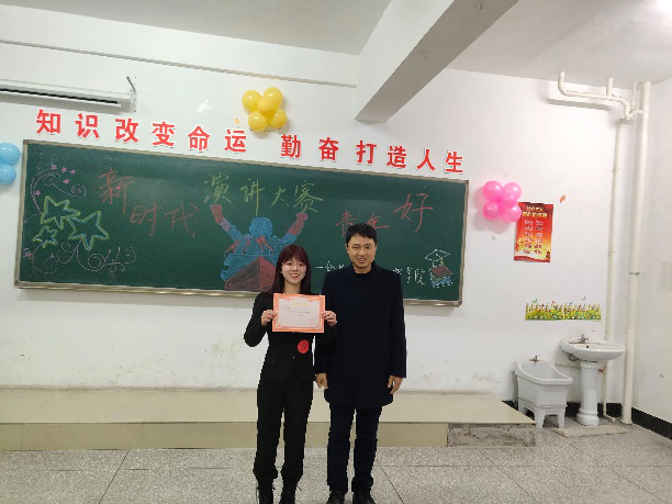本次演讲赛的特等奖获得者是闫书博同学。由学工办主任董莹老师为她颁奖。