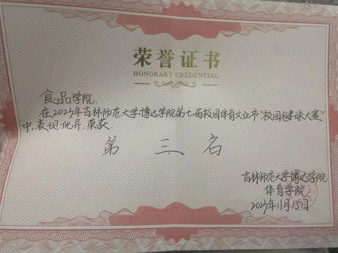羽毽翻飞笑语稠,扭缠巧妙赛灵猴,随心接送凭勾挑,恣意经营任点收。踢毽子是我国民间的一项体育游戏,被人们誉为“生命的蝴蝶”,历史悠久,全民性强。在体育学院举办的体育文化节中,食品科学与工程学院荣获毽球团体赛三等奖。
