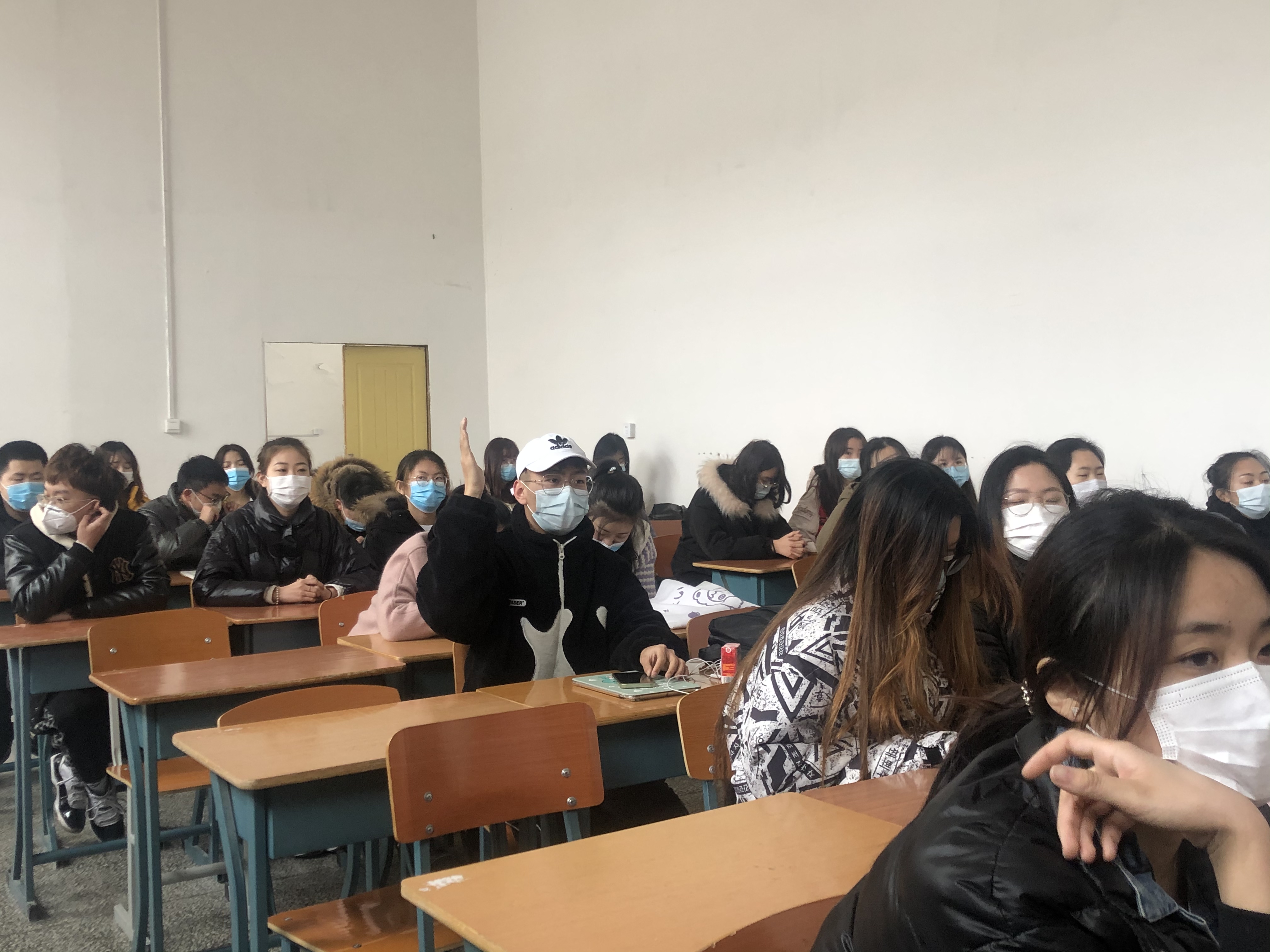 同学们在认真听老师讲课,同学甲深感难受,举手示意老师,表达其有些发热。任课教师立即安抚学生,全体师生检查并戴好口罩,班长立刻拍照留存座位图并及时联系辅导员老师,辅导员老师上报学校并立刻赶往现场,学校应急处置小组即刻前来带走发热学生,进入隔离观察室,由医务人员测温核查,同时辅导员与班长组织学生有序撤离,相关部门封锁教室并测温消毒。