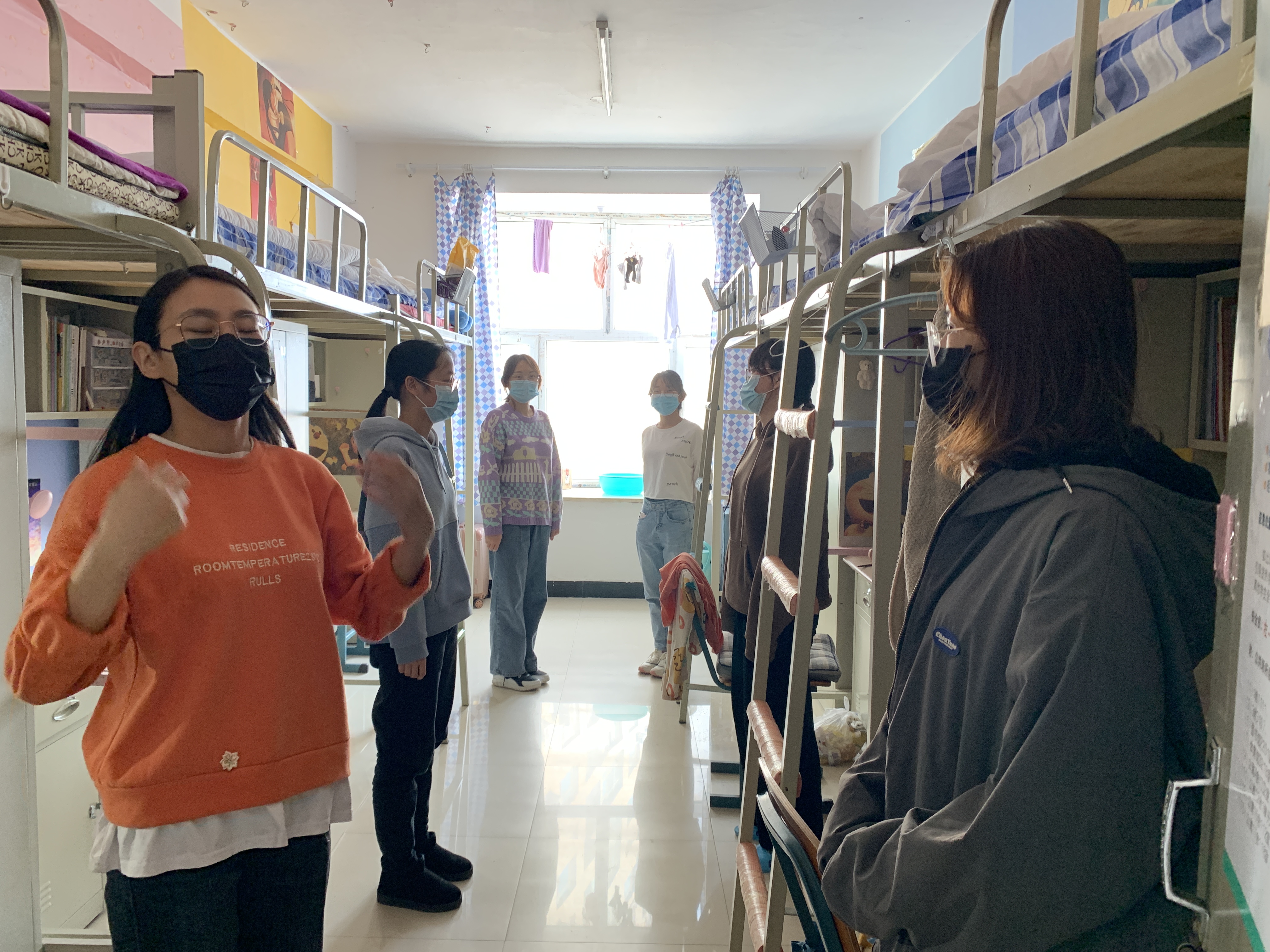 同学乙,突感自己发热,大声告知寝室成员并自觉戴好口罩,其他成员迅速整理戴好口罩,寝室长拿出温度计进行测温并立刻联系辅导员,辅导员确认高热体温后即刻上报并赶往现场,相关工作人员将发热学生带往隔离观察室测温核查,同时寝室长组织其他学生消毒通风,在寝室隔离。