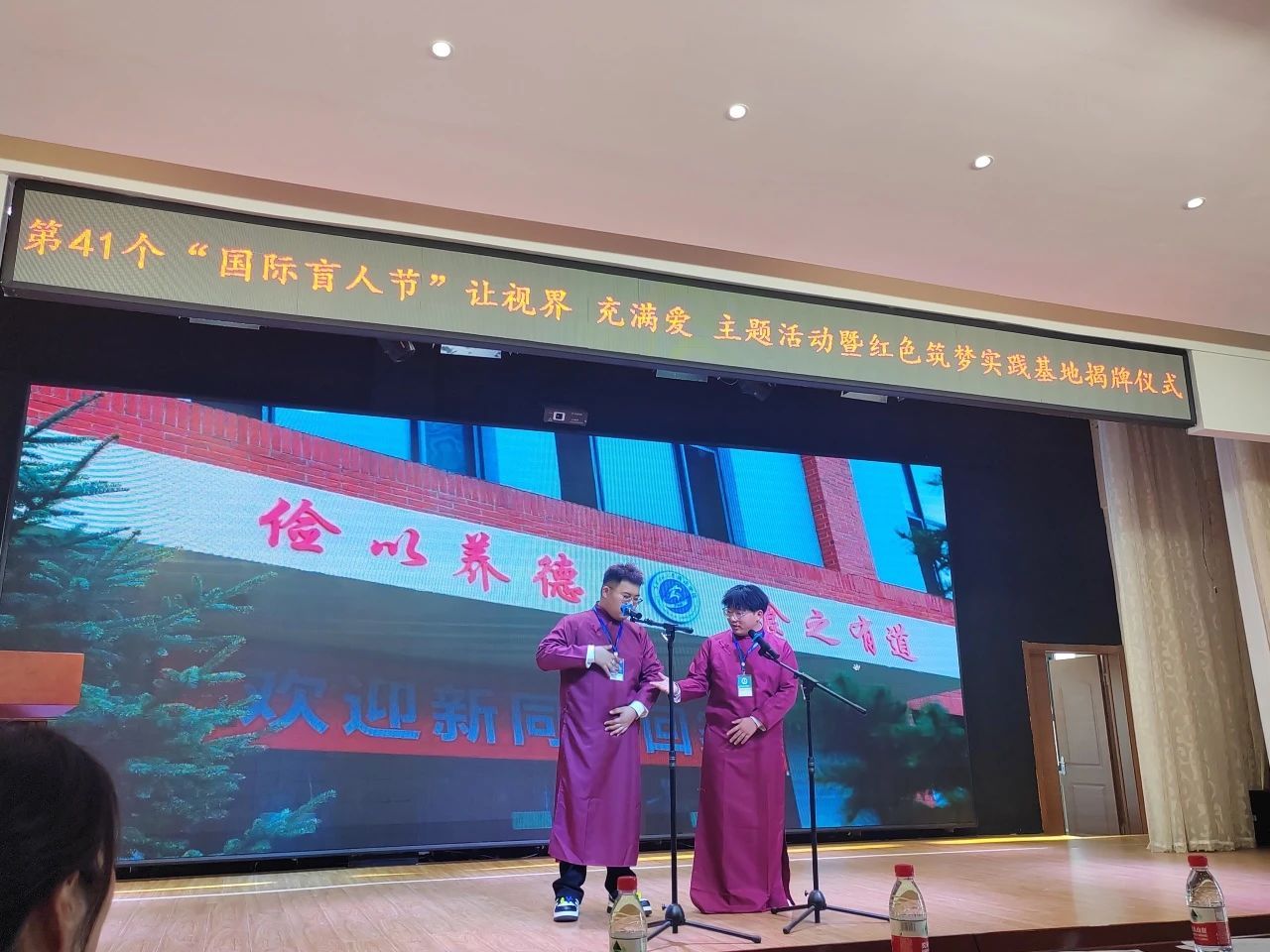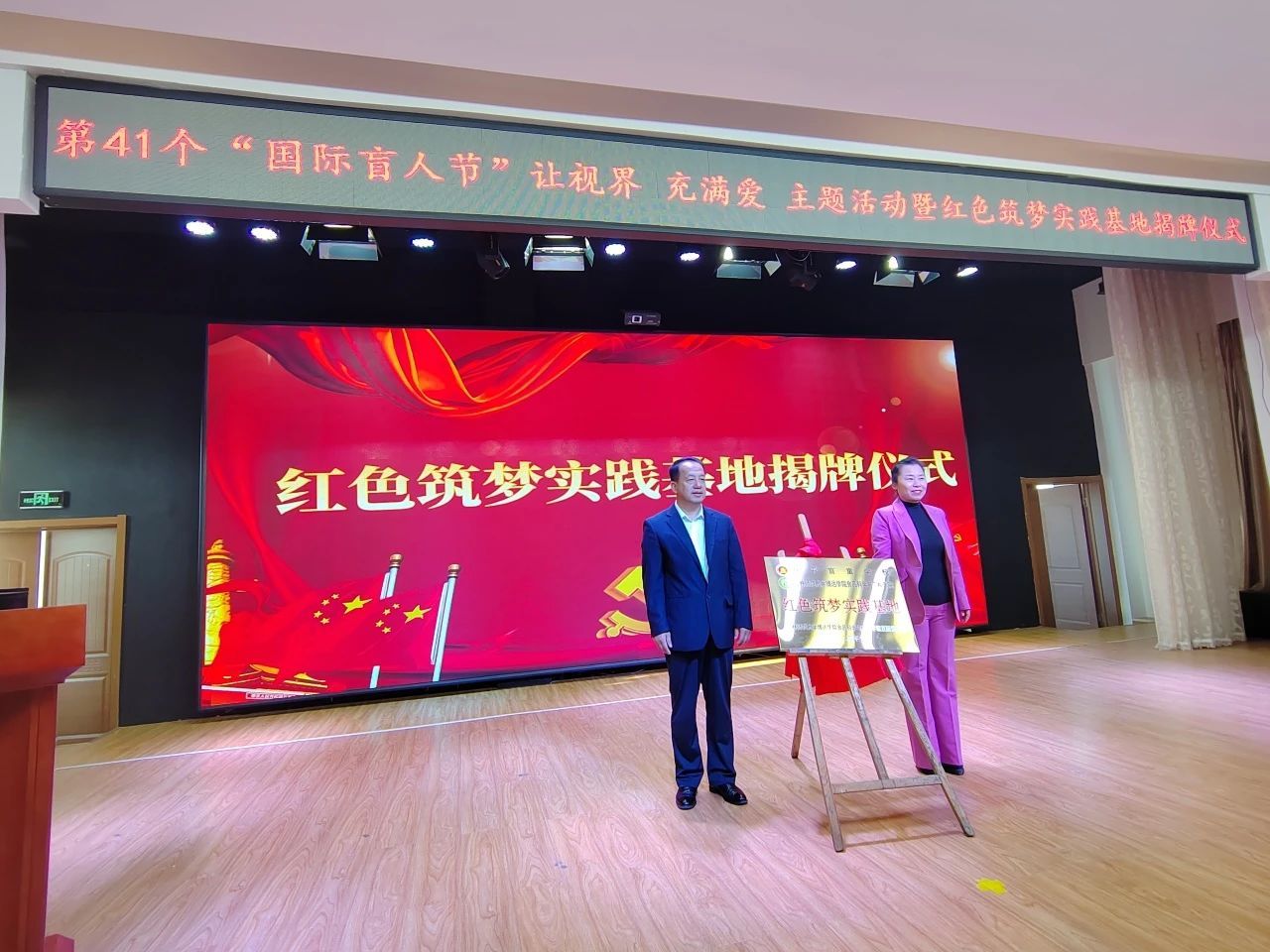 伴随着激昂的音乐声,四平市盲童学校校长孙山与吉林师范大学博达学院食品科学与工程学院院长周晓梅上台,共同为“红色筑梦实践基地”揭牌。