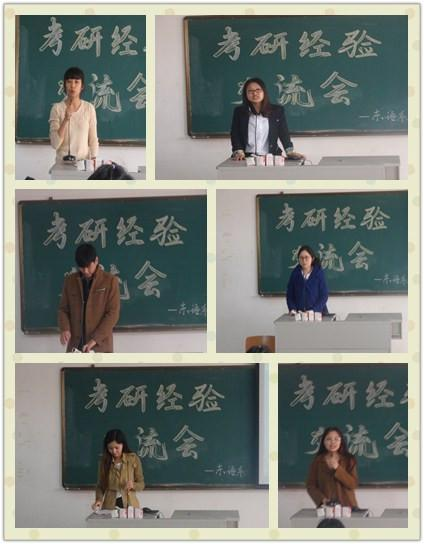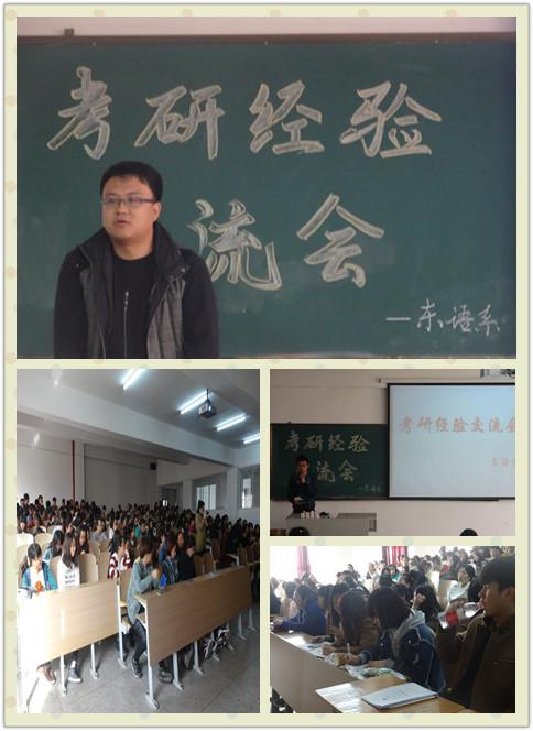交流会在12级张云鹏的主持下进行。首先,高立伟老师讲话,他对11级考研学生取得的优异成绩表示祝贺,并深入分析了当下的考研形势,鼓励同学们积极考研,希望同学们做好大学、人生规划,早准备、早实践,摆正心态,正视结果。接着,各位学长学姐向在座的同学做了自我介绍,他们分别以优异的成绩考入了江苏大学、天津外国语大学、延边大学、吉林师范大学等高校,并在此每个人针对自己所了解的情况对考研经验进行了交流。