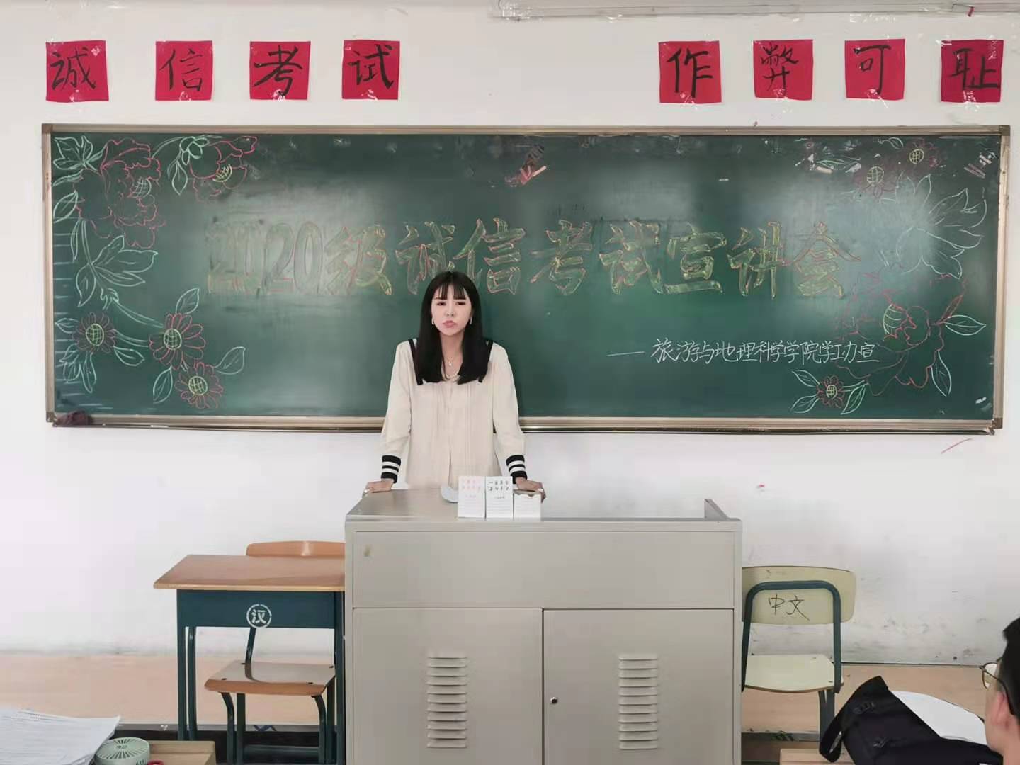 仲夏将至,等待同学们的还有最后的一场战役--期末考试。距离期末考试仅剩不到两个星期,整个学校进入了一个无比紧张的环节,校园的各处都充斥着浓浓的学习氛围。因此,旅游与地理科学学院于6月17日晚六点在老校区3322教室召开2020级诚信考试宣讲会,旅游与地理科学学院辅导员何珊珊老师主持召开会议。