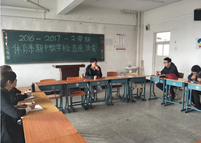 2017年4月26日16:00分体育系在1417教室召开2016-2017学年度第二学期期中教学检查教师座谈会。参加会议的有李响、张会萍、卢秉旭、陈立春、张宁宁及体育系任课教师。会议由卢秉旭主任主持。本次座谈会老师们肯定了体育系本学期的系风学风建设,学生到课率达到100%,课堂上积极与老师互动,气氛活跃。在课程方面,老师们对下学期课程安排和教学备品的申请提出了自己的想法。最后,由卢秉旭主任做总结发言,对老师们在各自工作岗位上的勤勉认真表示感谢,正是这些老师们的辛勤付出有力的保证了体育系的授课质量。在下学期课程安排方面,会和大家进一步沟通,达到各教学场馆利用率的最大化,也会和教务处及时申请按季节集中排课的问题。本次座谈会老师们讨论热烈,交流深入,达到了预期的效果,对我系的教学工作起到积极的促进作用。