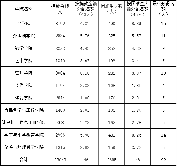 学校按照募集善款的总金额,按照每人发放1000元的标准确定学校名额。优先资助资助暑期受到台风摩羯灾害的学生11人,剩余名额的50%按照各学院学生募集善款的比例下发至各学院;剩余名额的另外50%按照各学院特别困难学生的比例下发至各学院。