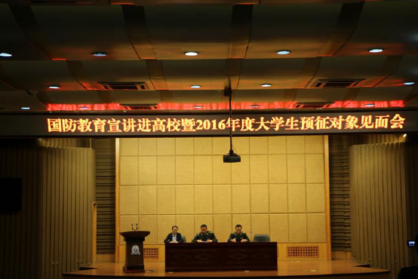 为进一步支持国防和军队建设,鼓励更多优秀大学生入伍,帮助大学生了解、掌握今年征兵工作有关政策、献身国防事业。5月17日下午14时,我院同学参加了“国防教育宣讲进高校”暨2016年度大学生预征对象见面会。