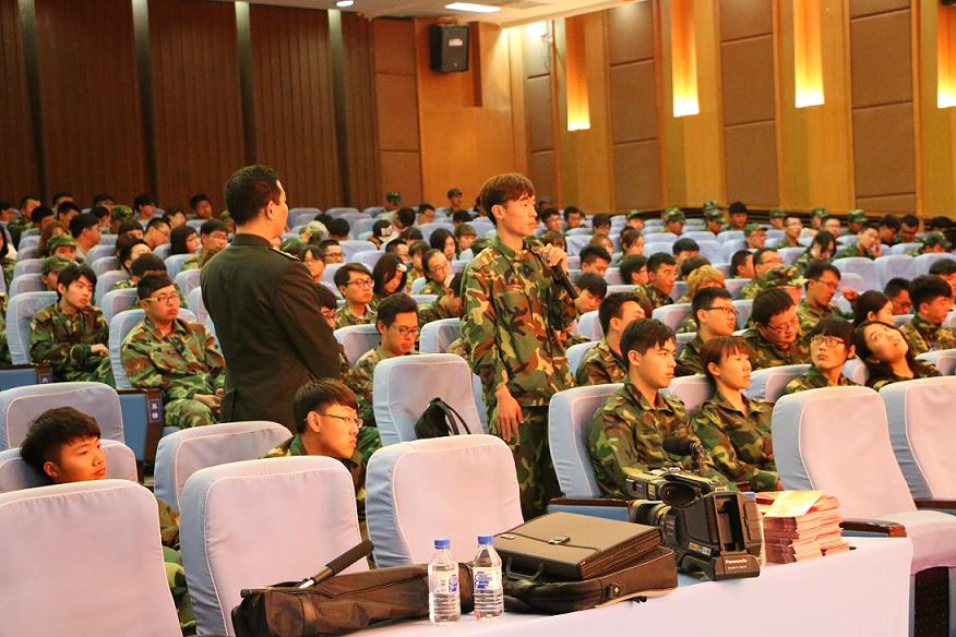 本次见面会历经两个小时,首先由吉林省国防教育讲师团刘万军教授向大家介绍了本次见面会的目的,并发表了主题为“长城有你更稳固”的宣传讲话。在讲话过程中,刘教授向同学们讲述了许多革命先烈的光荣事迹,同时也向大家介绍了大学生入伍的优惠政策,以及在部队可以获得的十三笔人生财富等。通过自己的经验积累,向我们描述了新兵进入军营生活后的酸甜苦辣,让同学们更加切实体会到了参军的魅力。在提问环节中,同学们积极地举手发言,向本场会议的嘉宾们问出自己对于参军的疑问。铁西区人武部纪来顺部长对同学们提出的问题做了详细的解答。