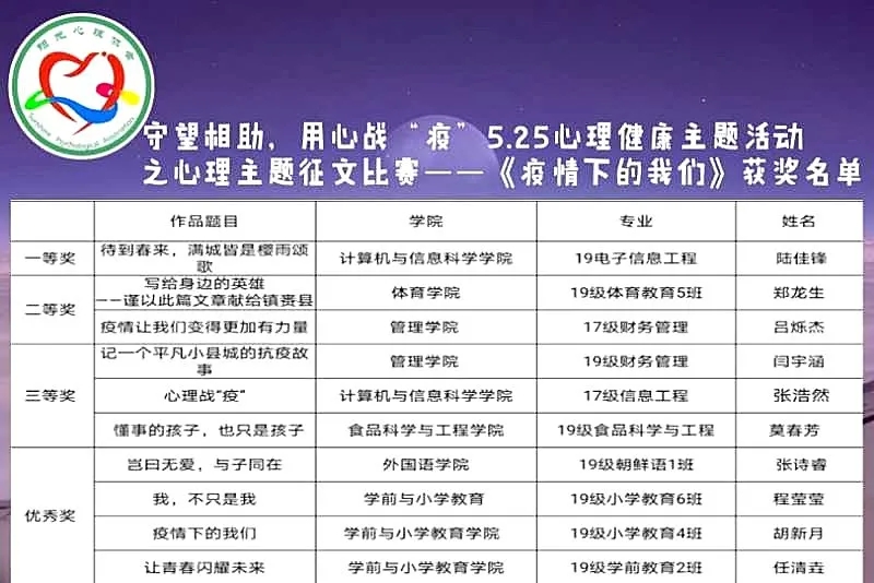 为进一步推动我校心理健康教育工作,广泛宣传普及心理健康教育知识,不断提高学生心理素质,营造我校人人关心心理健康教育的氛围,根据省教工委高校思政部《关于在2020年高校“‘5·25’大学生心理健康教育月”举行“四个一”专项行动的通知》结合当下新冠疫情防控形势以及我校心理健康教育工作实际,我校举办了“守望相助,用心战‘疫’”为主题的大学生心理健康月系列活动。