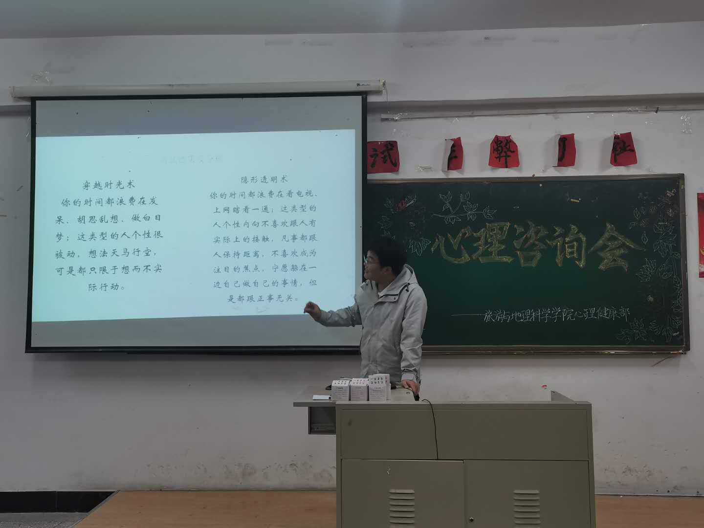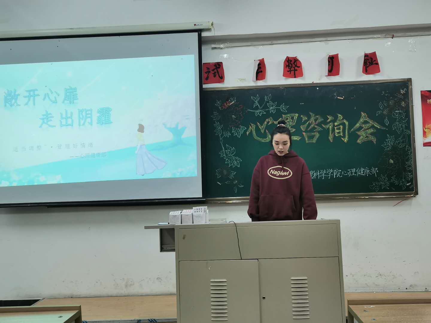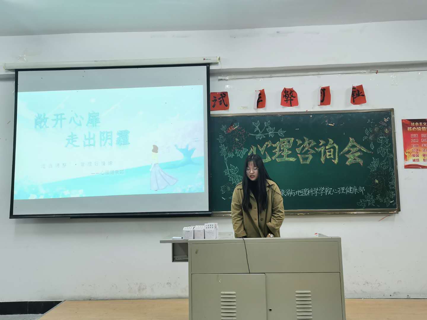 为帮助同学走出疫情期间的阴影,排解心中所累积的压力。树立正确的人生观、价值观、世界观,恢复良好的心态,积极阳光的开展疫后新生活,关注大学生的心理健康问题。吉林师范大学博达学院旅游与地理科学学院社团联合会心理健康部于10月12日在3322教室举办以“敞开心扉,走出阴霾”为主题的心理咨询会。