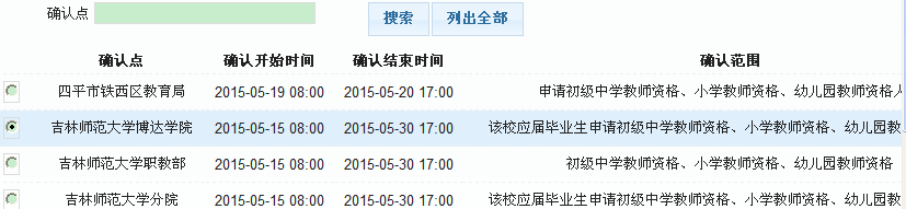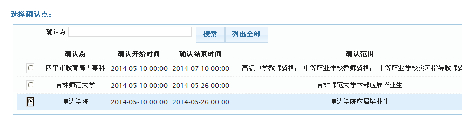 6.第五步“选择现场确认点”页面,选择现场确认地点,申请幼儿园、小学教师资格和初级中学教师资格的同学请选择吉林师范大学博达学院前面的单选按钮,如图6;申请高级中学教师资格的同学请选择博达学院前面的单选按钮,如图7。选择好后点击下一步。