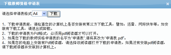 如正确请点击“下载教师资格申请表”,下载打印此表,如图16。用A4纸打印此表,打印完成后将此表按照下图复印成A3纸反正面(此表一式两份现场确认时交至学工办,第二页承诺书本人签字处必须填好,时间按第一页填表日期写),如图17、图18。