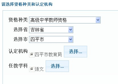 4.第一步申请人必读、第二步网上申报协议,要详细阅读内容,避免出现错误。第三步选择资格种类和认定机构页面,注意:(1)资格种类项目,小学教育专业和小学教育(英语)专业选择小学教师资格,学前教育专业选择幼儿园教师资格,其他专业选择高级中学教师资格;(2)选择省份项目选择吉林省;(3)选择市项目选择四平市;(4)认定机构项目小学教师资格和幼儿园教师资格选择四平市铁西区教育局,高级中学教师资格选择四平市教育局;(5)任教学科项目选择根据专业进行选择(注意一定要准确选择,选择点击确认后要返回如图4页面,核对学科是否正确),点击下一步。如图4。