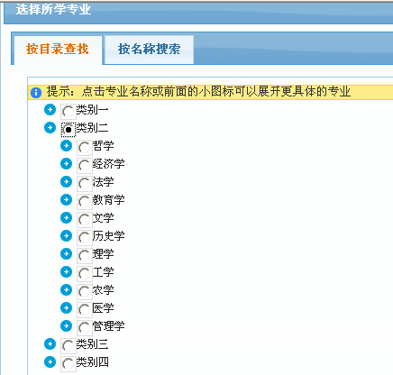 (7)所学专业选择时,需要点击类别二前面的 T4FN~A8%5d6%5b8P@7T.jpg">箭头形状,下面会有如哲学,经济学等选项,找到与所学专业名称完全相同的进行选择,如图10