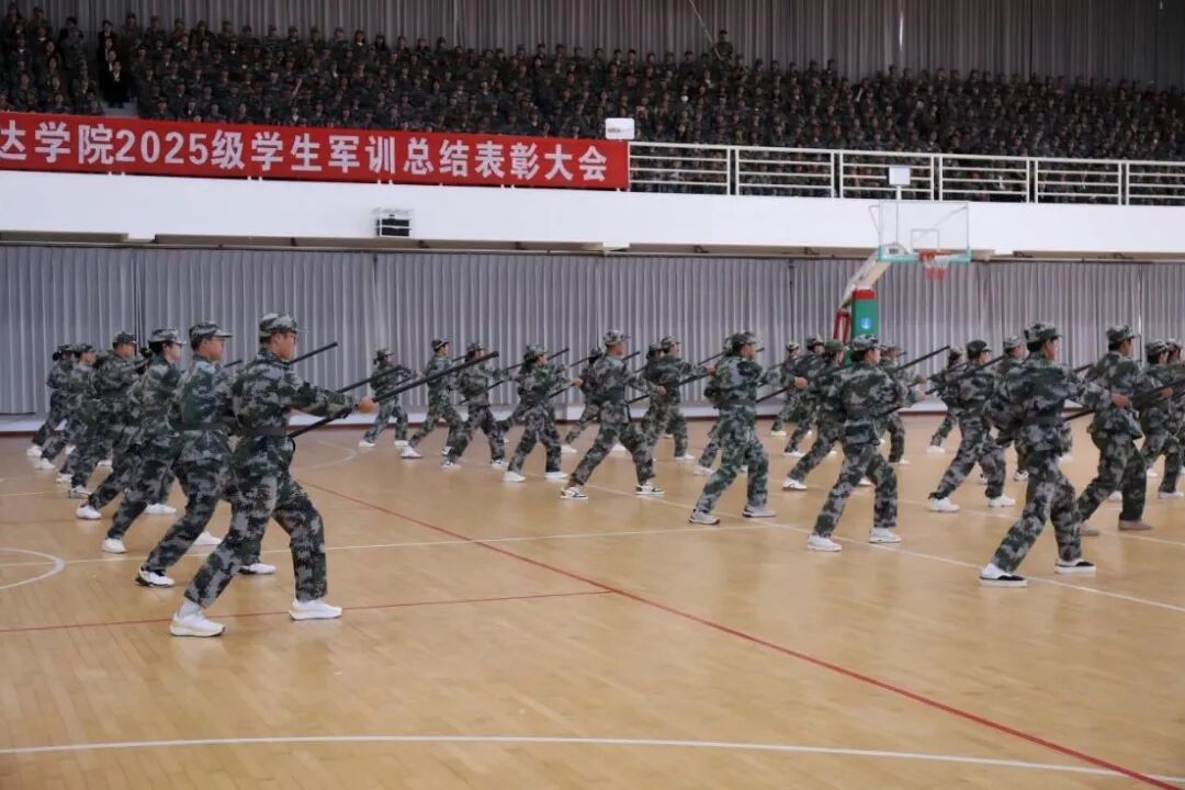 在庄严的国歌声中,2025级学生军训总结表彰大会拉开了帷幕。军训团团长刘英杰指挥各学院进行特色科目表演,同学们步伐整齐、口号响亮,展示了军体拳、刺杀操、格斗术等军事项目,展现出博达学子昂扬向上的精神风貌。