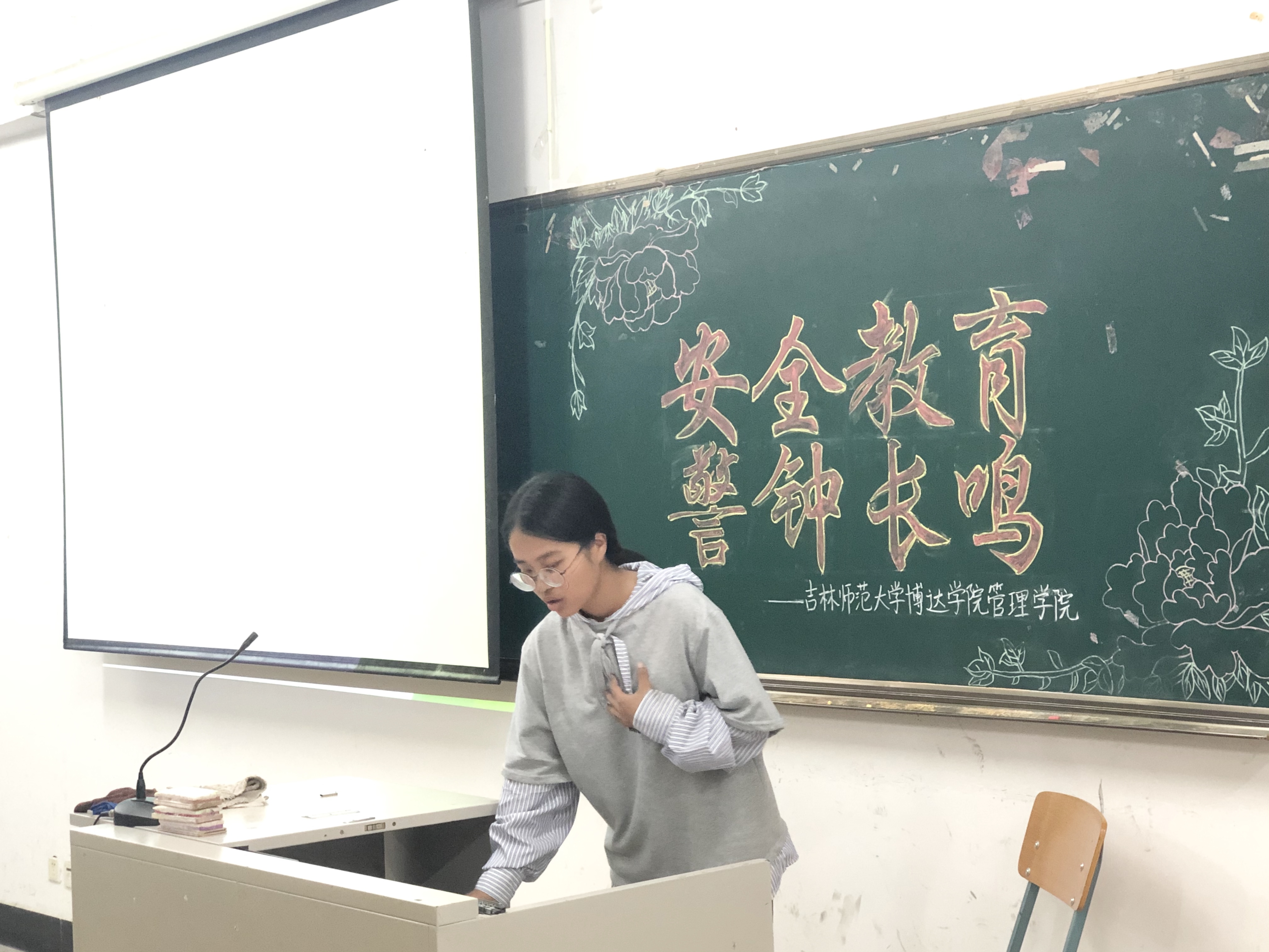 校园安全问题事关重大,与每一位师生密切相关,不容忽视。为提高同学的安全防范意识,构建文明和谐、平安稳定的校园环境,吉林师范大学博达学院管理学院于2019年9月25日晚,在3421及3520阶梯教室举行了以“安全教育 警钟长鸣”为主题的安全教育班会。出席本次教育班会的有辅导员助理王柏楠、分团委副书记郭春静、学生会副主席薛浩然、各班班代以及全体大一新生。