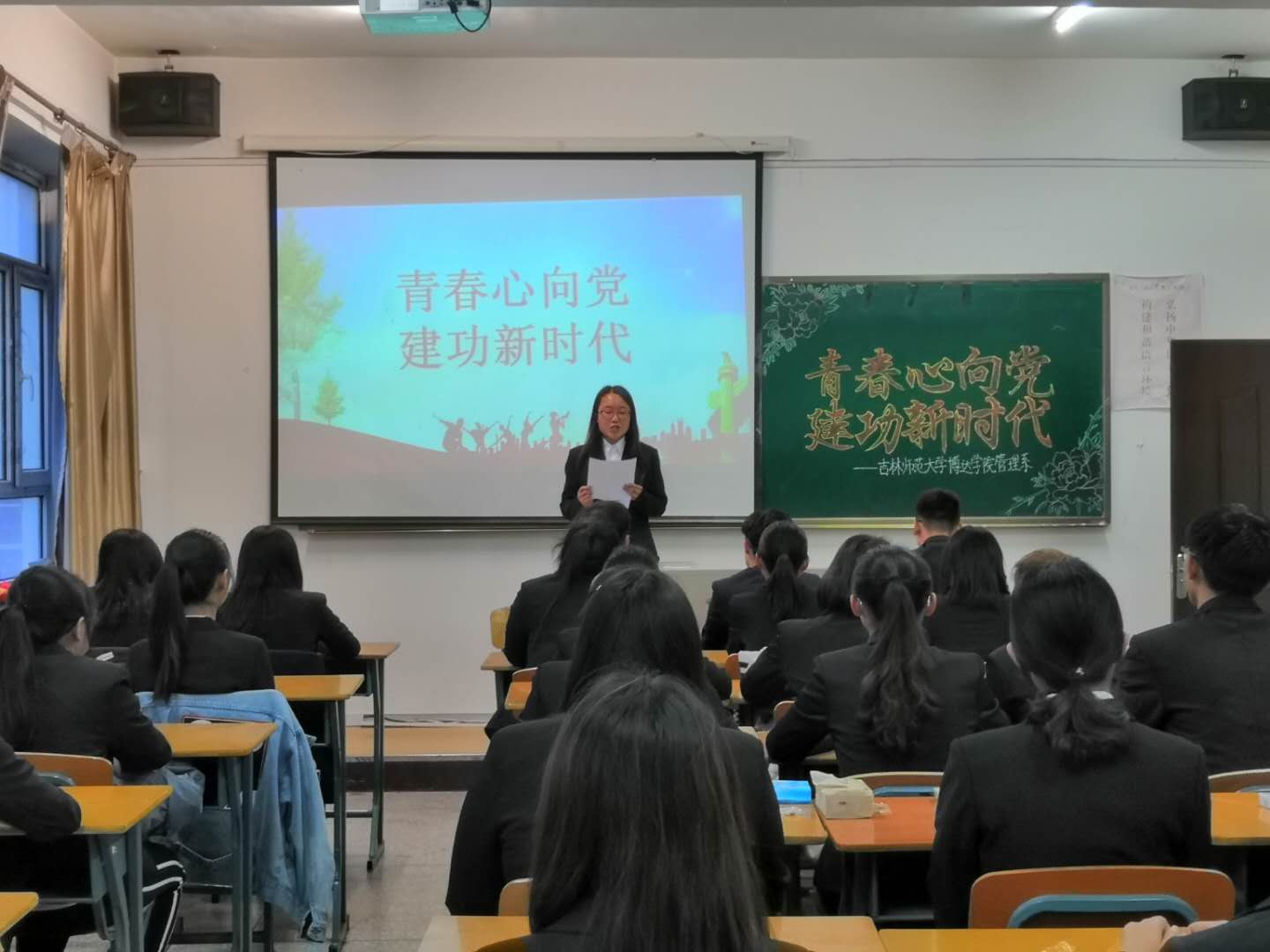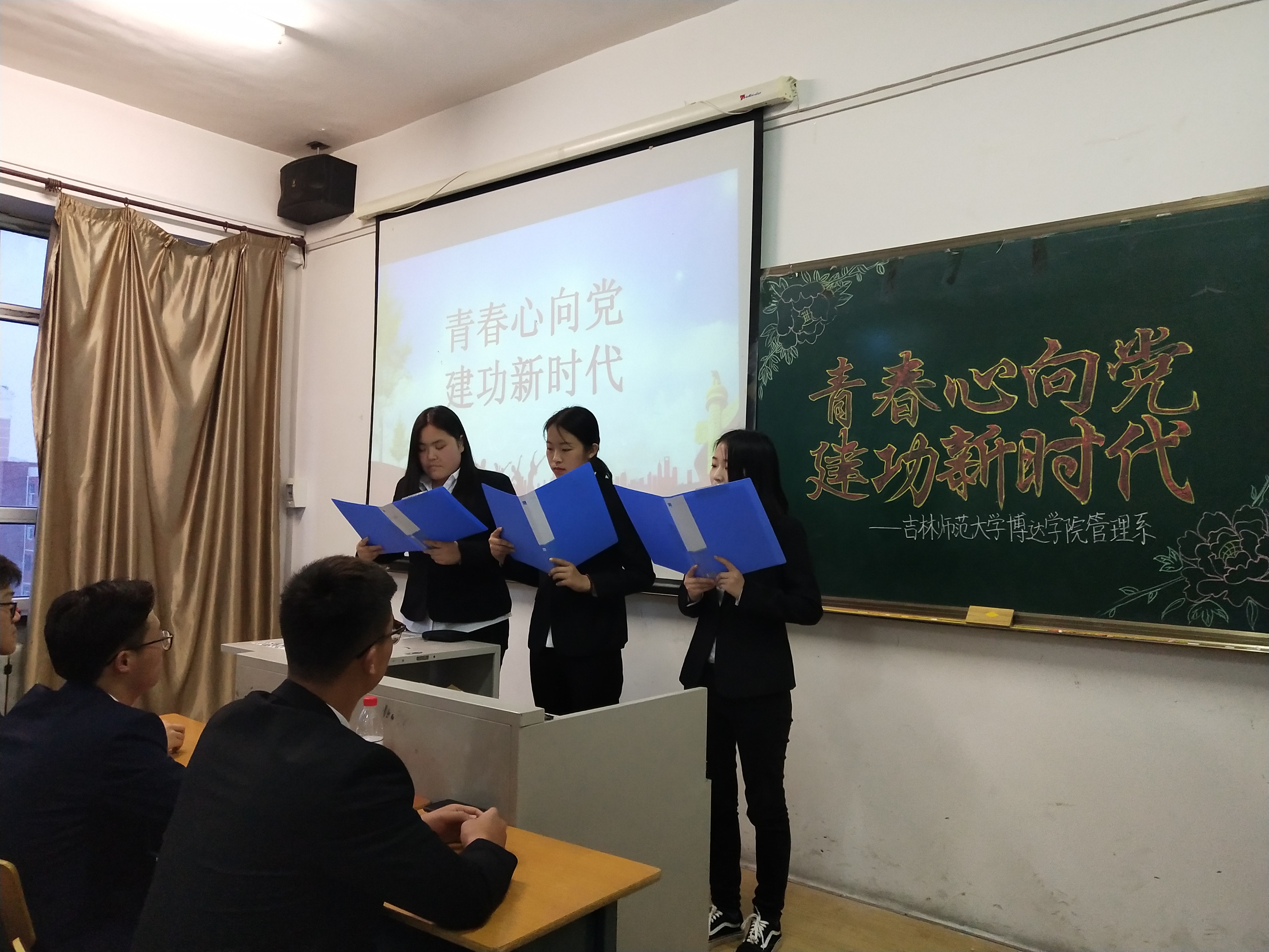 为庆祝中华人民共和国成立70周年、纪念五四运动100周年,激励和引导广大青少年大力弘扬爱国主义精神。吉林师范大学博达学院管理系分团委于4月29日在3602教室开展了“青春心向党,建功新时代”五四主题团日活动。此次活动由2018级财务管理专业一班的董泽宇、吕昕阳主持,出席人员为管理系分团委书记耿丽娜、宣传委员梁婧、组织委员蒋迪以及2018级入党积极分子。