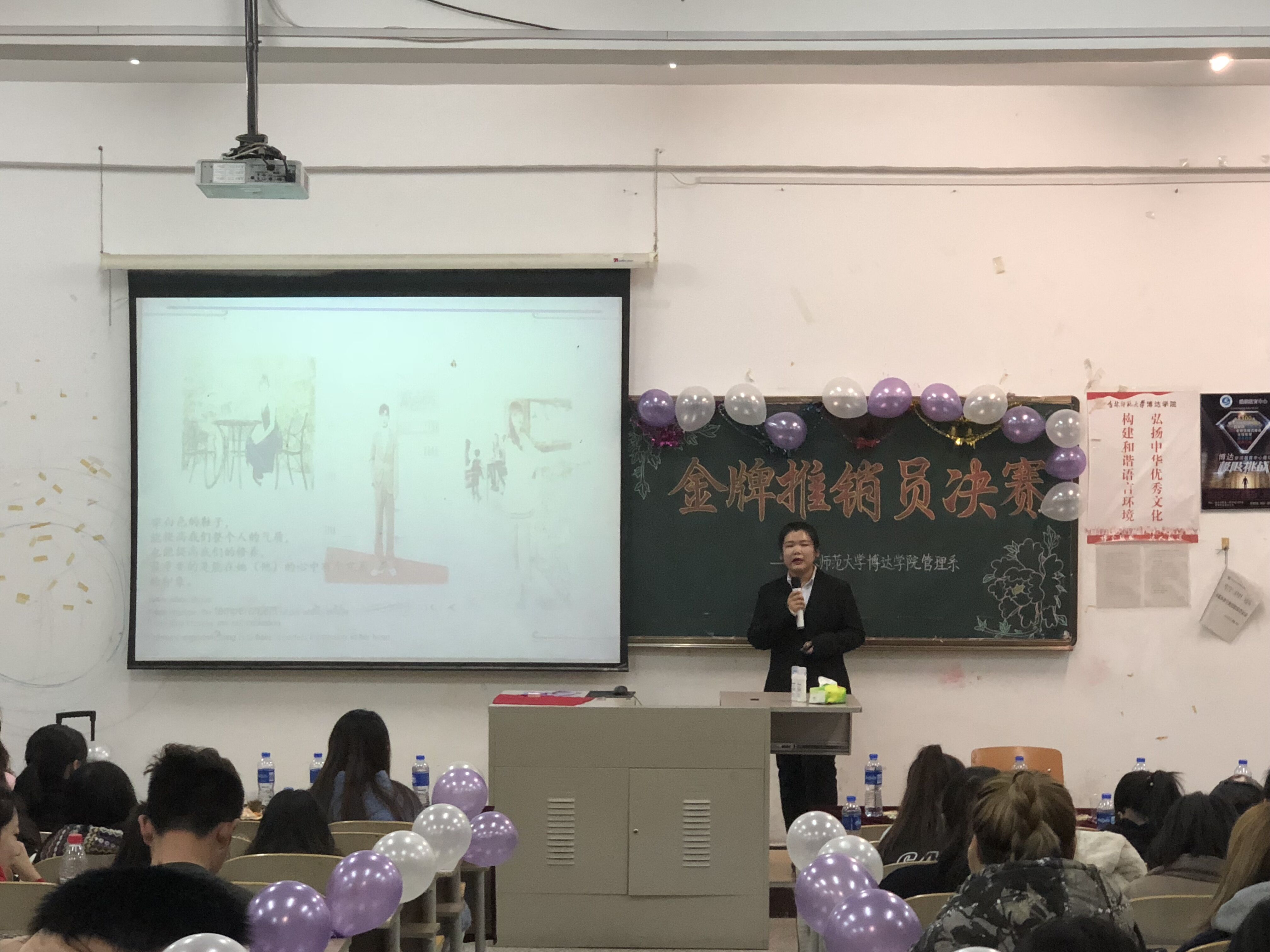 为培养同学们的口头表达能力,提高对营销实践经验的积累,吉林师范大学博达学院管理系学生会创业部,勤工俭学部举办了金牌推销大赛,于2018年11月14日下午3点30分在3521教室举行。出席此次活动的嘉宾有辅导员全承志老师,梁婧老师,教学秘书李慧老师和高曼曼老师,以及学生会社联主席和部长们,活动主要参加人员为2018级管理系同学。