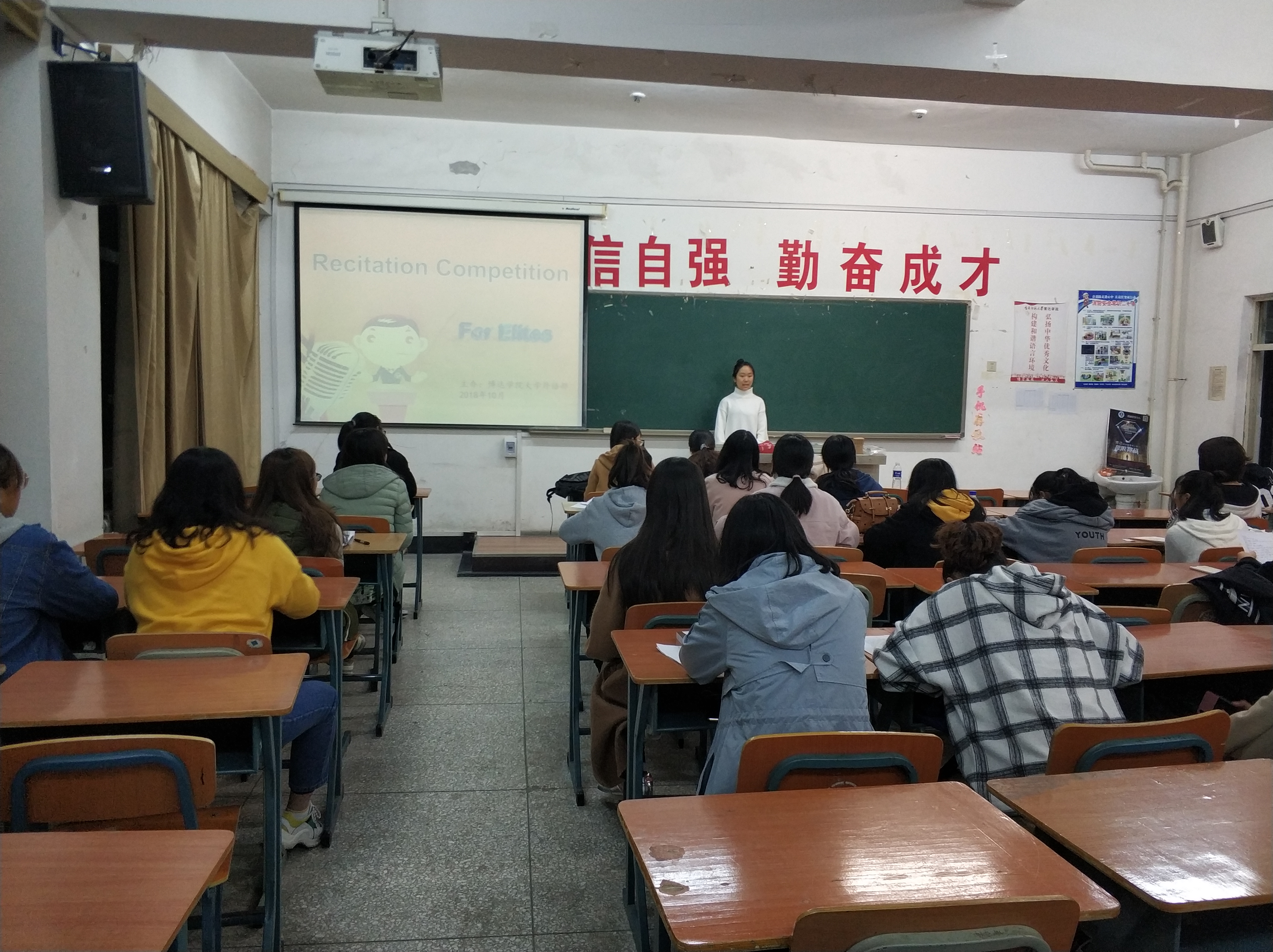 金秋十月,硕果飘香,博达学院大学外语部迎来了2018级英语精英班第一次活动——英语朗诵比赛。10月12日晚6点,跃跃欲试的参赛选手们和满怀热情的观众同学们齐聚老校区1523教室,以朗诵的形式表达了他们对英语学习的热爱。