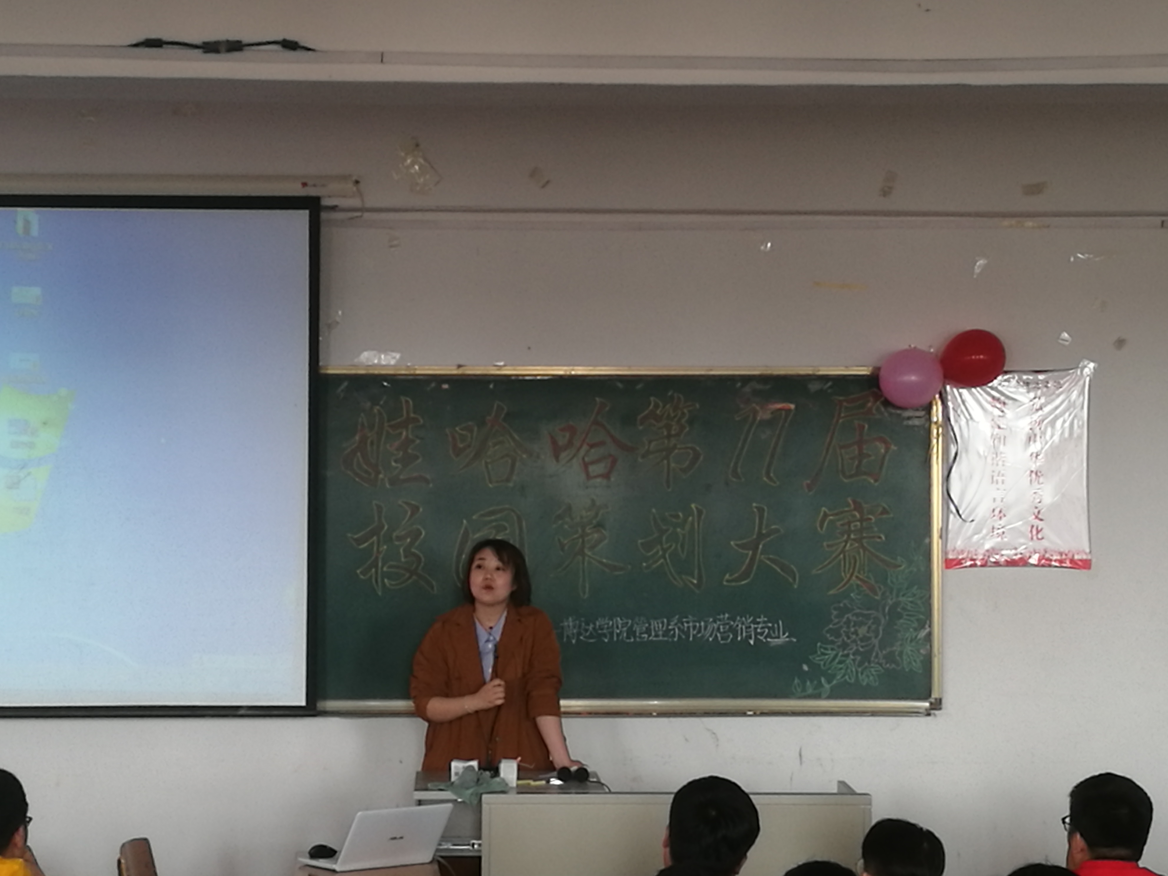 2018年5月23日下午2点,吉林师范大学博达学院管理系市场营销专业的全体同学在3421教室进行“娃哈哈第11届校园策划大赛”。出席本次活动的老师有管理系主任赵亚芬老师、学工办主任耿丽娜,市场营销专业老师朱丹老师、杨亮老师,管理系老师蔡艳杰老师,东北地区娃哈哈销售代表也出席了本次活动。
